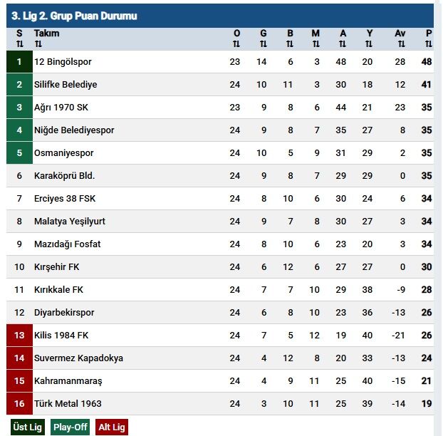 | 12 | Diyarbekirspor | 24 | 6 | 8 | 10 | 23 | 36 | -13 | 26 |