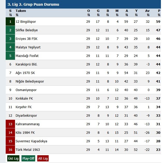 | 9 | Osmaniyespor | 29 | 11 | 6 | 12 | 40 | 40 | 0 | 39 |