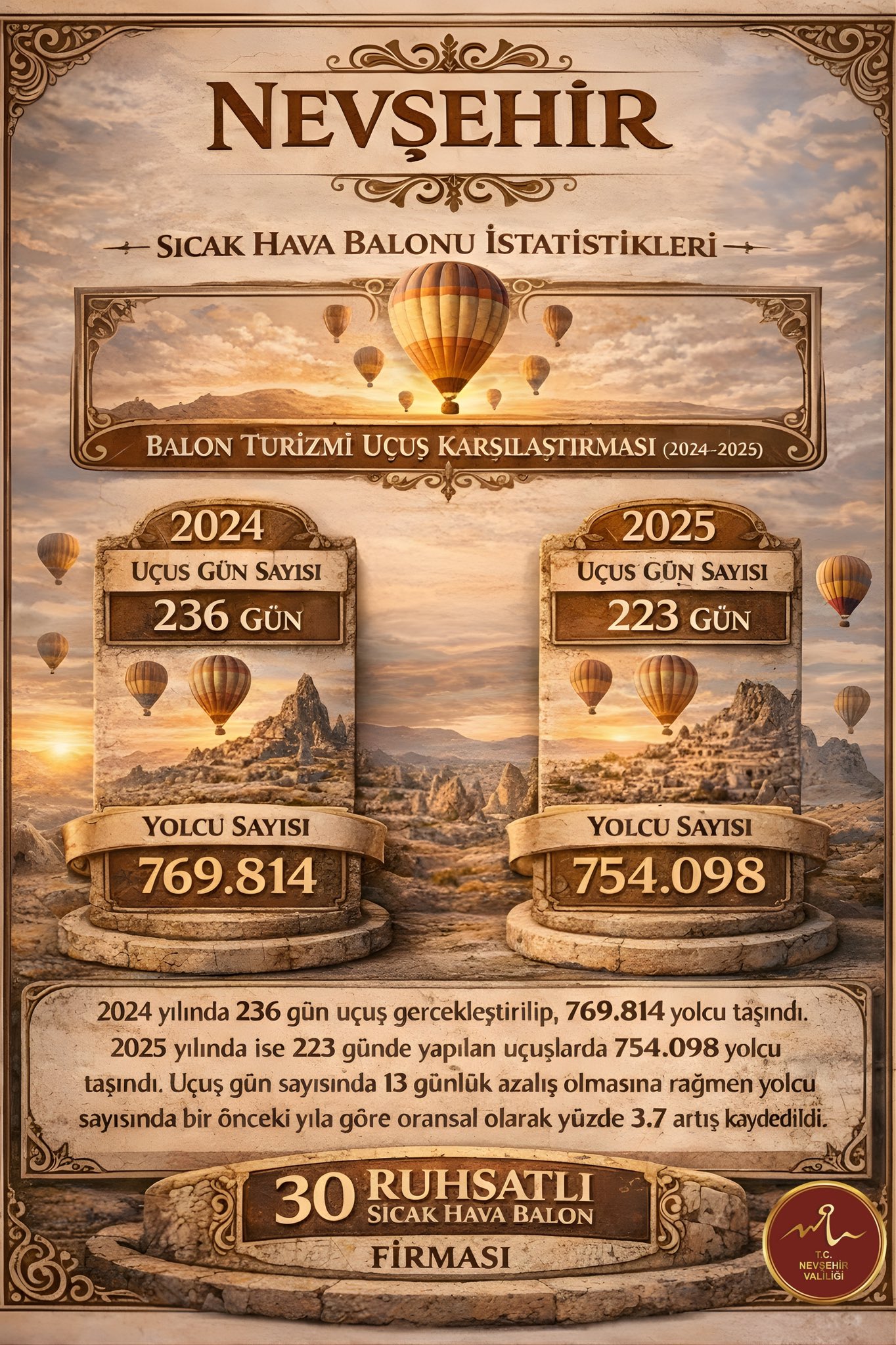 Nevşehir’de 2025 sonu itibarıyla 30 ruhsatlı sıcak hava balon firması faaliyet gösteriyor.