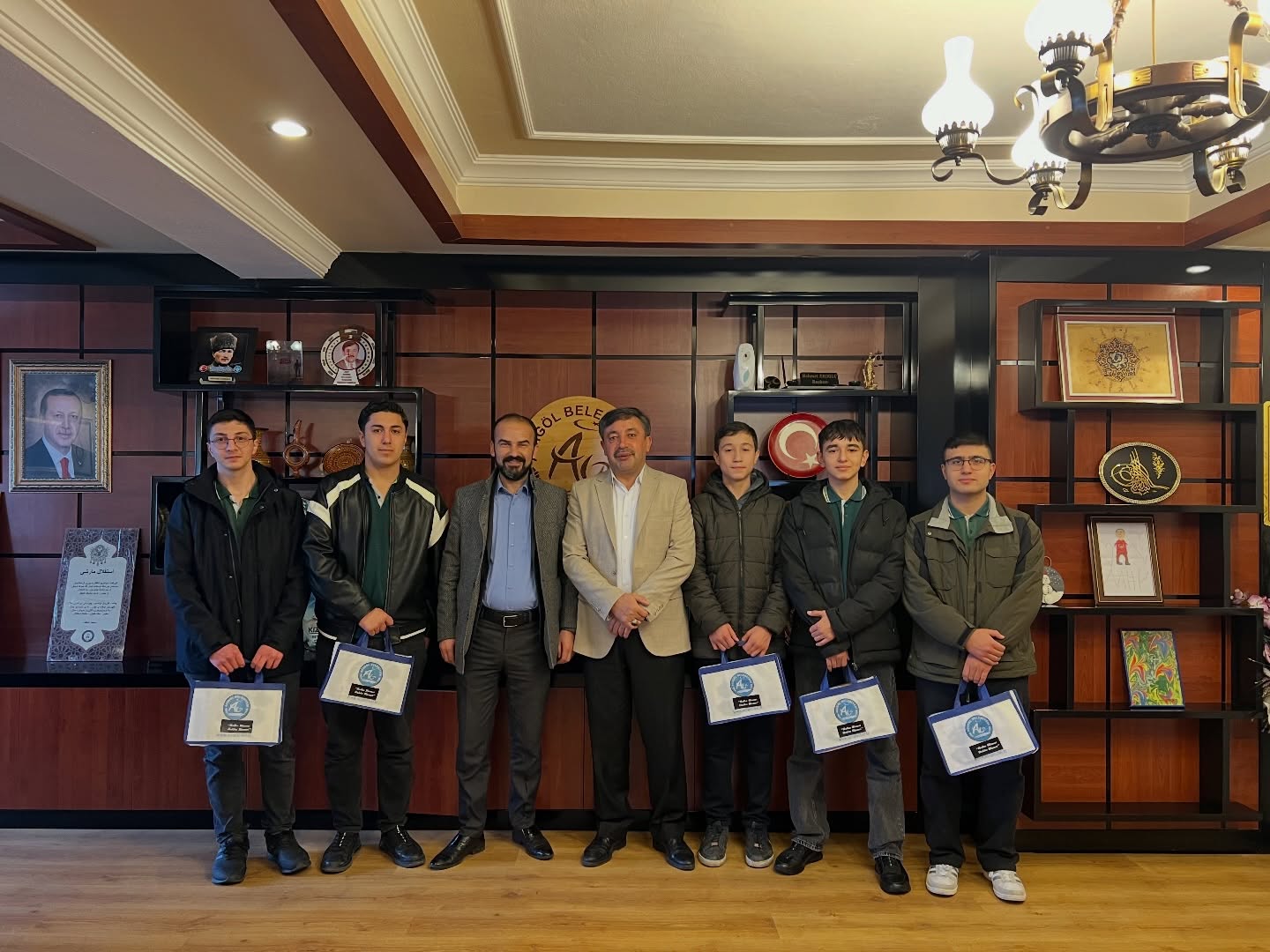 Yarışmalarda dereceye giren öğrenciler Durmuş Ali Aksamaz, Muhammed Erdoğan, Olcay Samet Sert, Muhammed Ali Durmuş, Musap Ege Yolyapan, Sadi Ören, Zeynep Soylu ve Özlem Gümüş, okul idarecileri ve öğretmenleriyle birlikte Belediye Başkanı Mehmet Eroğlu’nu ziyaret etti.