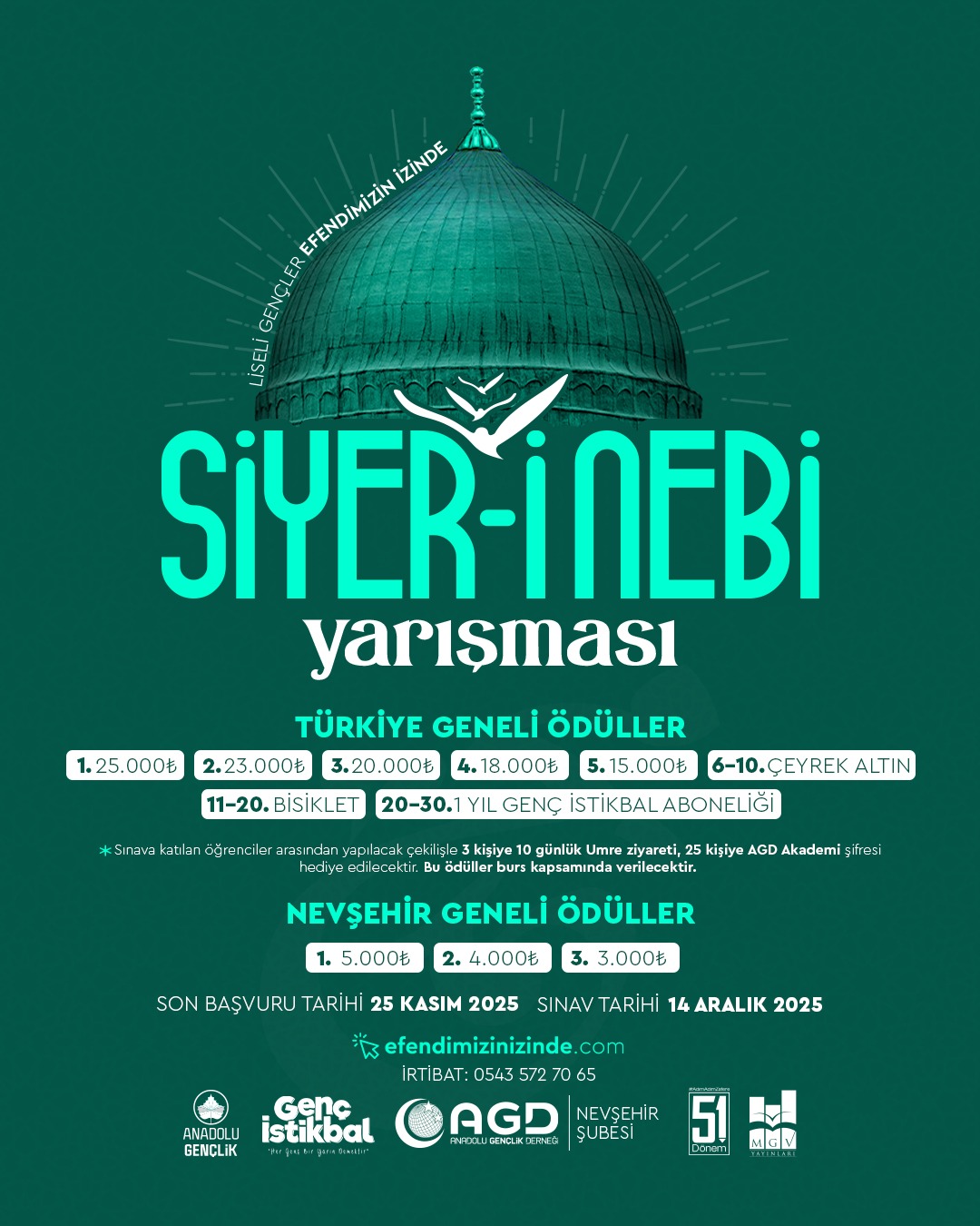 Anadolu Gençlik Derneği (AGD), gençliğin ahlak ve karakter temelli yetişmesi amacıyla her yıl düzenlediği “Efendimizin İzinde Siyer-i Nebi Yarışması” için başvuruları başlattı. Liseli gençlere yönelik düzenlenen yarışma, Hazreti Muhammed’in (s.a.v.) hayatını, mücadelesini ve örnekliğini gençlerin gönlüne nakşetmeyi hedefliyor.
