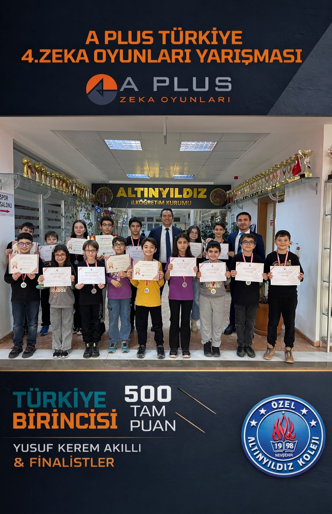 A PLUS TÜRKİYE 4. Zeka Oyunları Yarışması’nda Altınyıldız İlköğretim Kurumu öğrencisi Yusuf Kerem Akıllı, 500 tam puan alarak Türkiye 1’incisi oldu. Elde edilen bu büyük başarı, kurumun akıl ve zeka oyunları alanındaki sistemli ve nitelikli çalışmalarının somut bir göstergesi olarak dikkat çekti.
