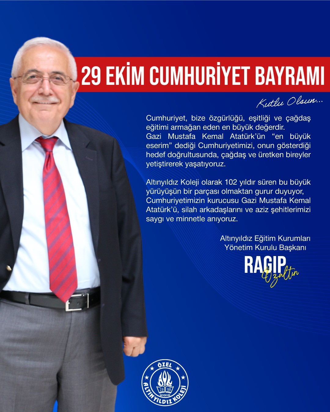 Altınyıldız Eğitim Kurumları Yönetim Kurulu Başkanı Ragıp Özaltın mesajında: " Cumhuriyet, bize özgürlüğü, eşitliği ve çağdaş eğitimi armağan eden en büyük değerdir.