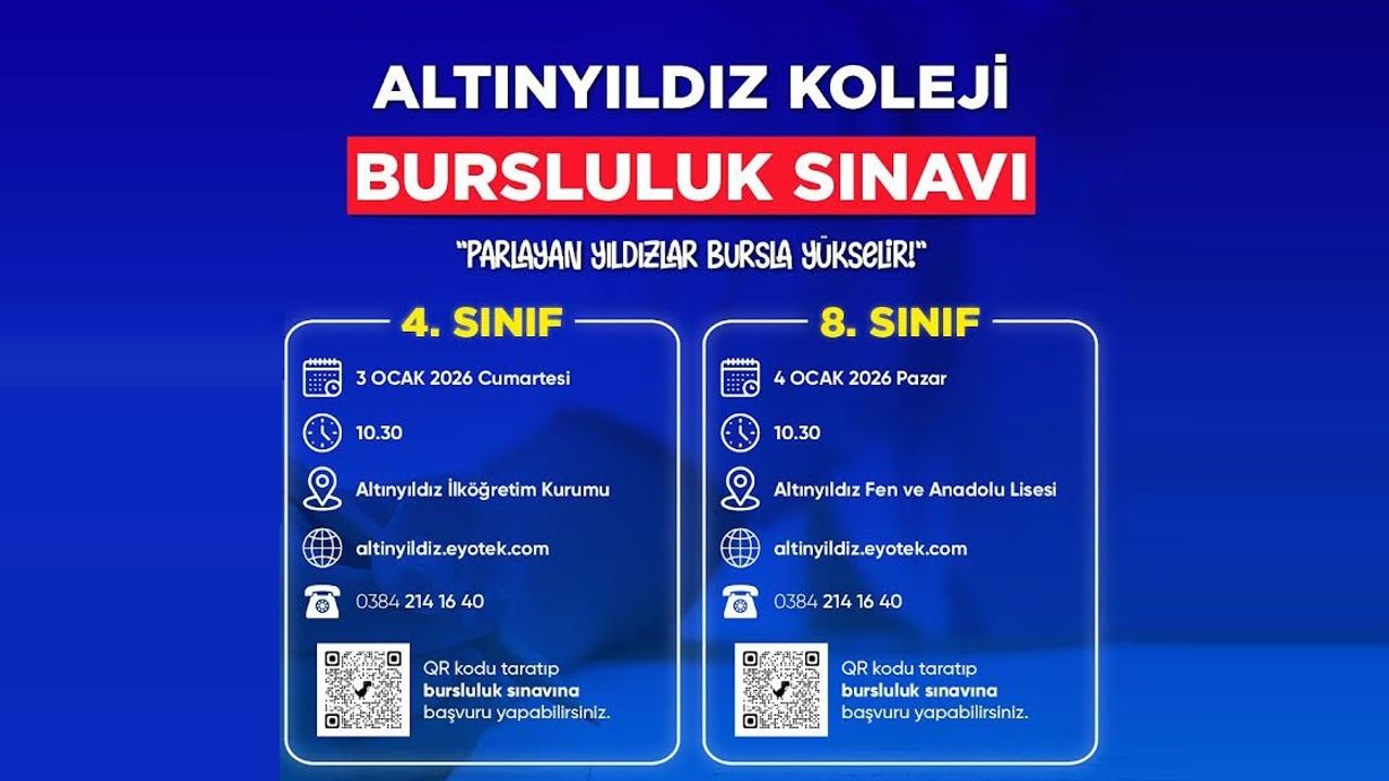 Bursluluk sınavı başvuruları 1 Aralık 2025 Pazartesi günü (bugün) başladı. Öğrenciler ve veliler başvurularını altinyildiz.eyotek.com adresinden veya afişte yer alan QR kodu okutarak kolayca gerçekleştirebileceklerdir.