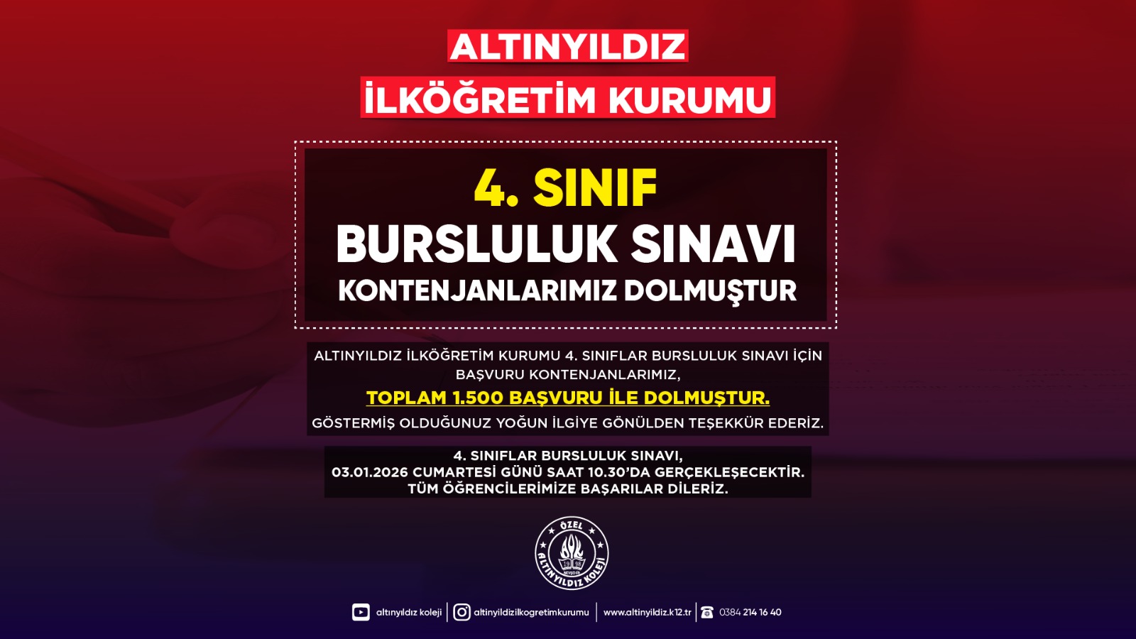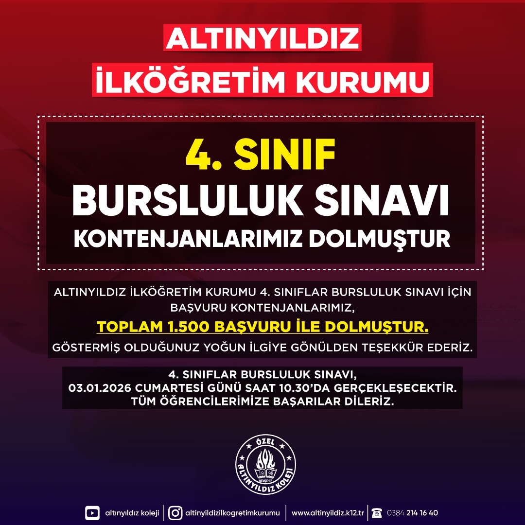 Altınyıldız İlköğretim Kurumunun 4. sınıflar bursluluk sınavı, her yıl olduğu gibi bu yılda da rekor bir başvuru aldı. Nevşehir Merkez ve tüm ilçelerden yoğun ilgi gören sınav, 1 haftalık sürede 1500 öğrenci başvurusuna ulaştı ve kontenjan tamamen dolarak başvurular kapandı.