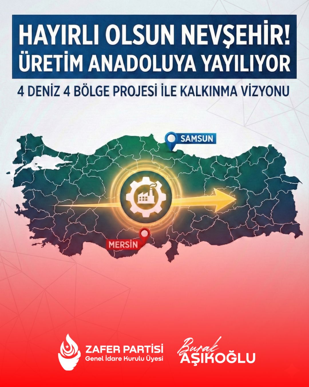 Zafer Partisi Genel İdare Kurulu (GİK) Üyesi Burak Aşıkoğlu, Sanayi Alanları Master Planı kapsamında Samsun–Mersin hattında yer alan Nevşehir’in yeni yatırım alanlarına kavuşacak olmasını memnuniyetle karşıladıklarını açıkladı. Aşıkoğlu, bu gelişmenin hem Nevşehir’in kalkınması hem de Türkiye’nin üretim güvenliği açısından son derece önemli olduğunu vurguladı.