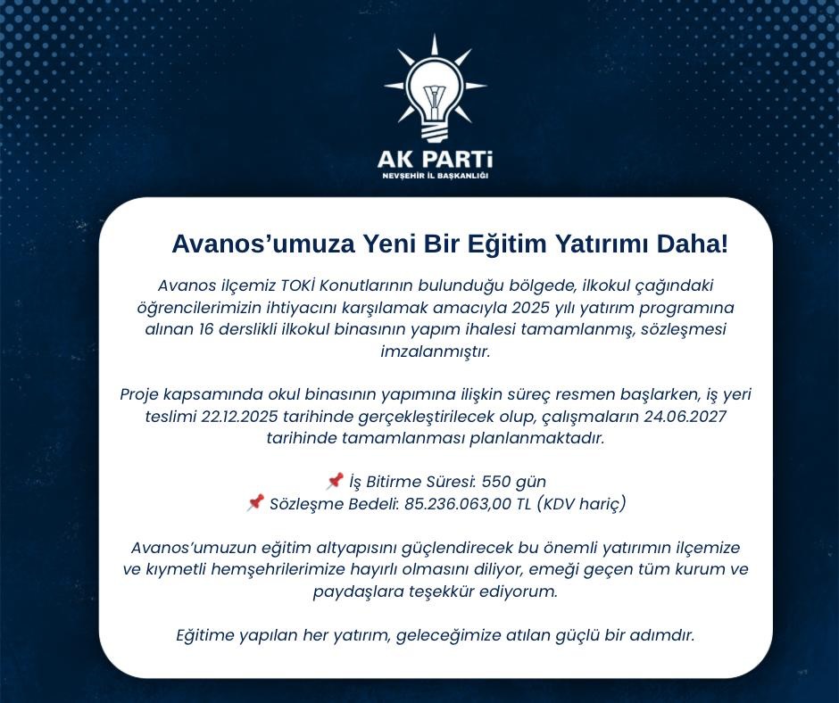 “Avanos ilçemiz TOKİ Konutlarının bulunduğu bölgede, ilkokul çağındaki öğrencilerimizin ihtiyacını karşılamak amacıyla planlanan 16 derslikli ilkokul binasının yapım ihalesi tamamlanmış ve sözleşmesi imzalanmıştır. Avanos’umuzun eğitim altyapısını güçlendirecek bu önemli yatırımın ilçemize ve kıymetli hemşehrilerimize hayırlı olmasını diliyor, emeği geçen tüm kurum ve paydaşlara teşekkür ediyoruz. Eğitime yapılan her yatırım, geleceğimize atılan güçlü bir adımdır.”