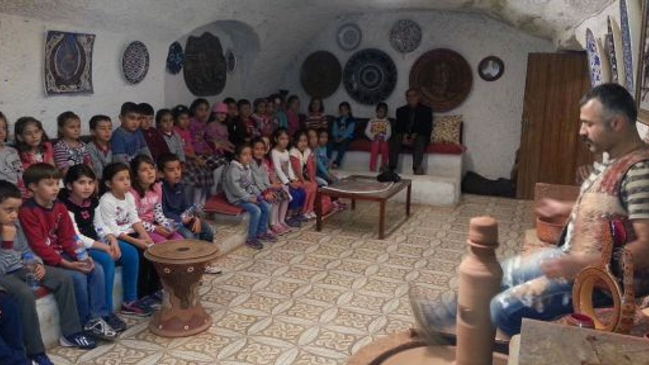 NEVŞEHİR(MHA) Kapadokya'nın el sanatları merkezi durumundaki Avanos'ta ilköğrenimlerini sürdüren öğrencilerden daha önce çanak yapımını görmemiş olanlar düzenlenen bir etkinlikle ustaların hünerli ellerinden çanak yapım aşamalarını izledi.