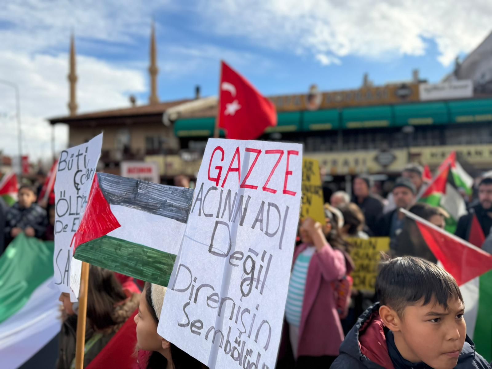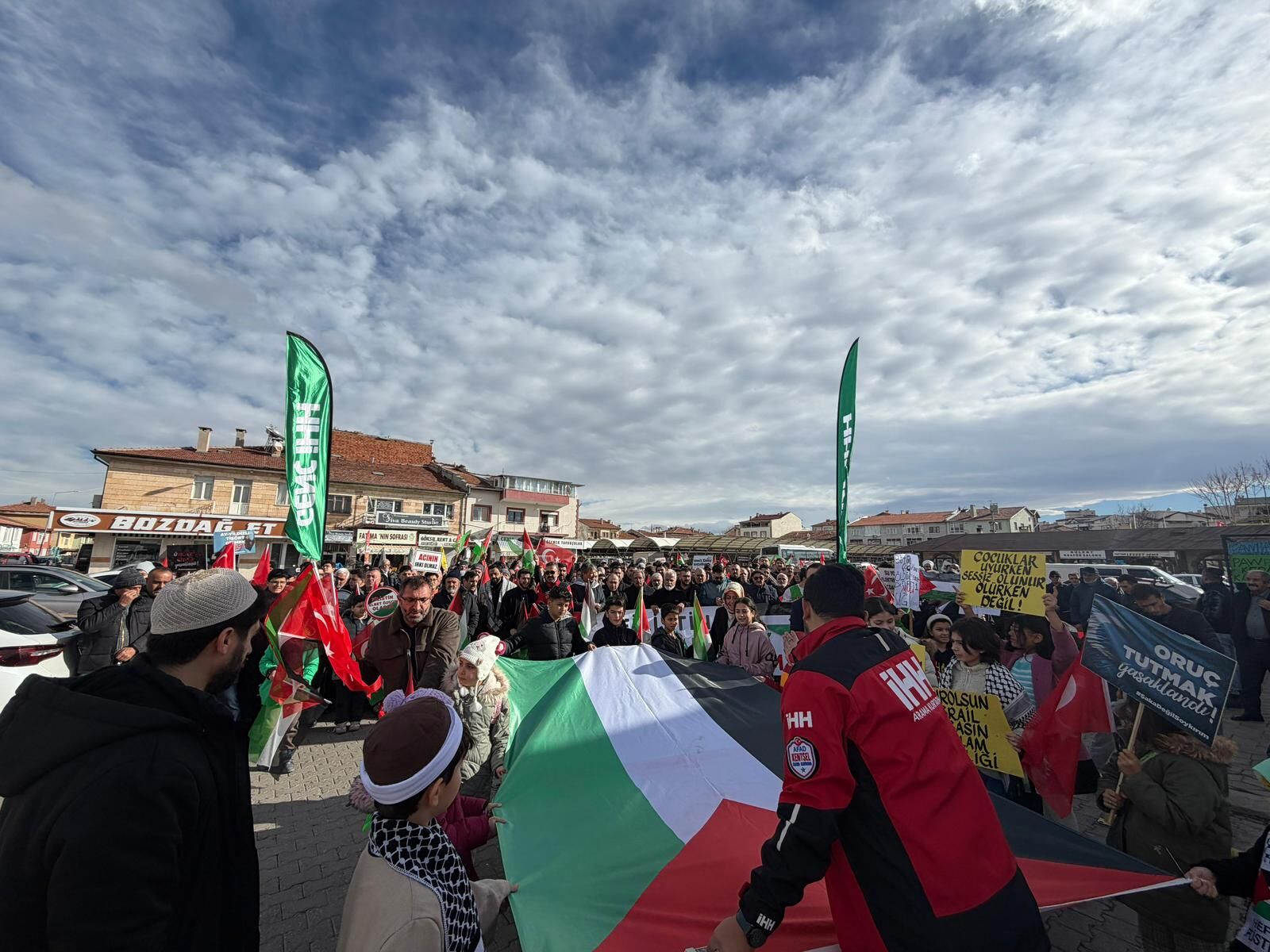 Ellerinde pankartlar ve bayraklarla yürüyen vatandaşlar, mazlum Filistin halkının, Doğu Türkistanlı Müslümanların ve dünyanın farklı bölgelerinde zulüm gören tüm insanların sesi olmak için tek yürek oldu.