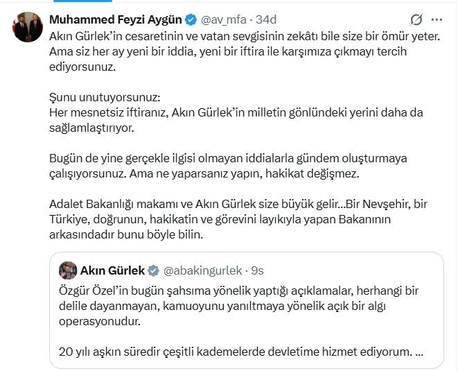 AK Parti Nevşehir İl Başkanı Av. Muhammed Feyzi Aygün, Adalet Bakanı ve Nevşehirli hemşehri Akın Gürlek hakkında ortaya atılan iddialara tepki göstererek destek mesajı yayımladı.