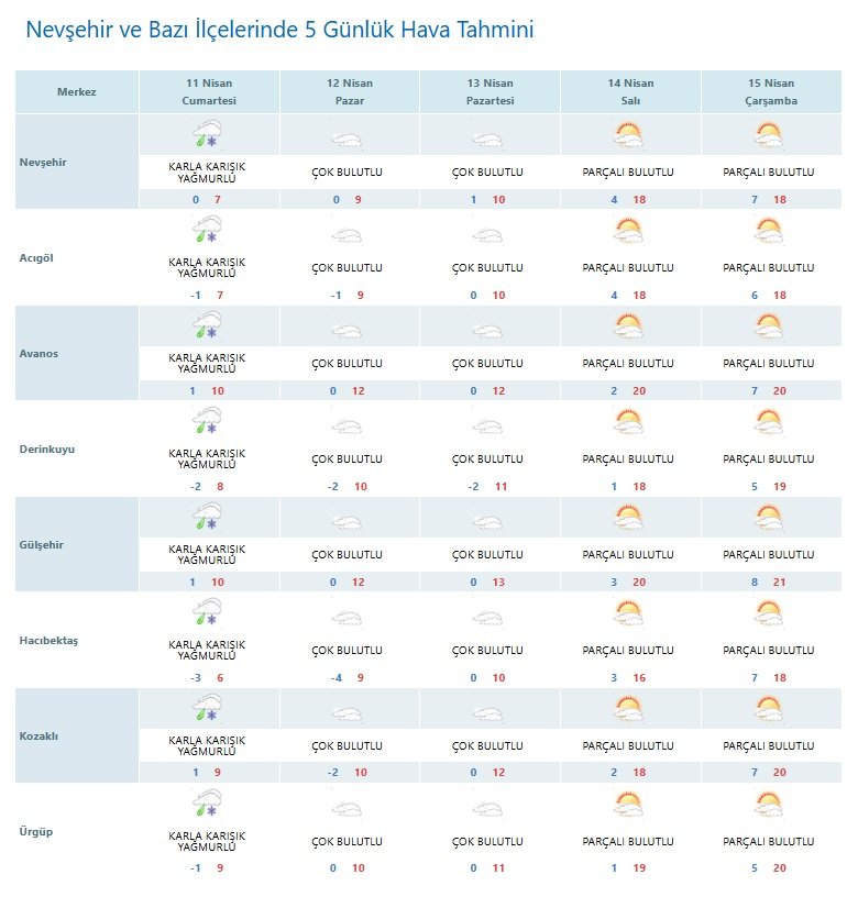 Nevşehir ve ilçelerinde hafta sonu boyunca karla karışık yağmur ve çok bulutlu hava etkili olacak. Yeni haftayla birlikte parçalı bulutlu bir hava beklenirken sıcaklıklar kademeli olarak artacak.