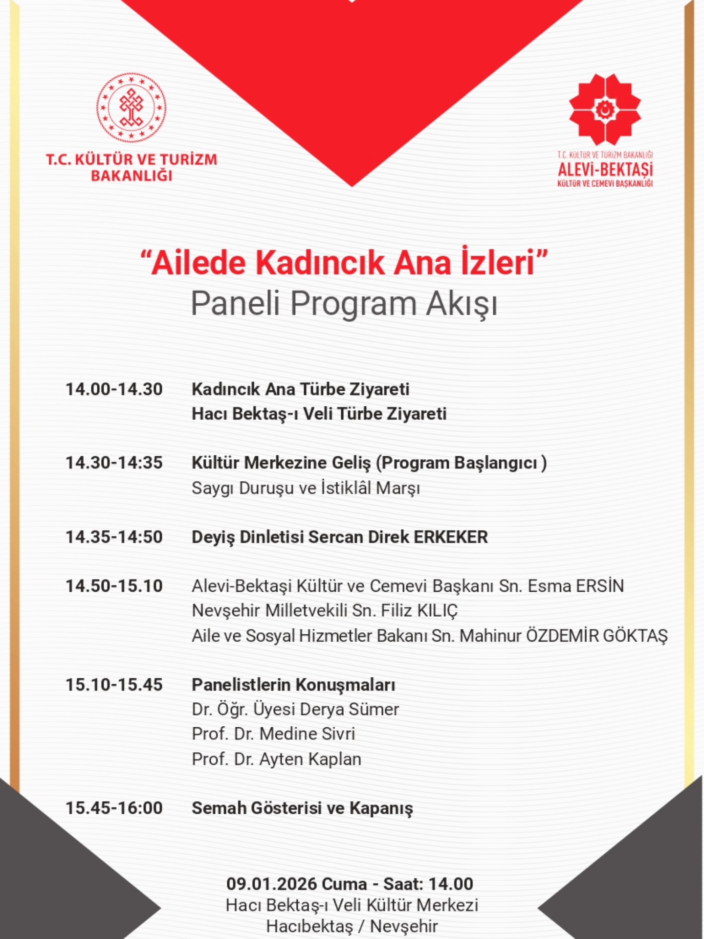 Program kapsamında sanatçı Sercan Direk Erkeker tarafından deyiş dinletisi sunulacak. Etkinlikte ayrıca Alevi-Bektaşi Kültür ve Cemevi Başkanı Sayın Esma Ersin, Nevşehir MHP Milletvekili Filiz Kılıç ve Aile ve Sosyal Hizmetler Bakanı Mahinur Özdemir Göktaş birer konuşma yapacak.