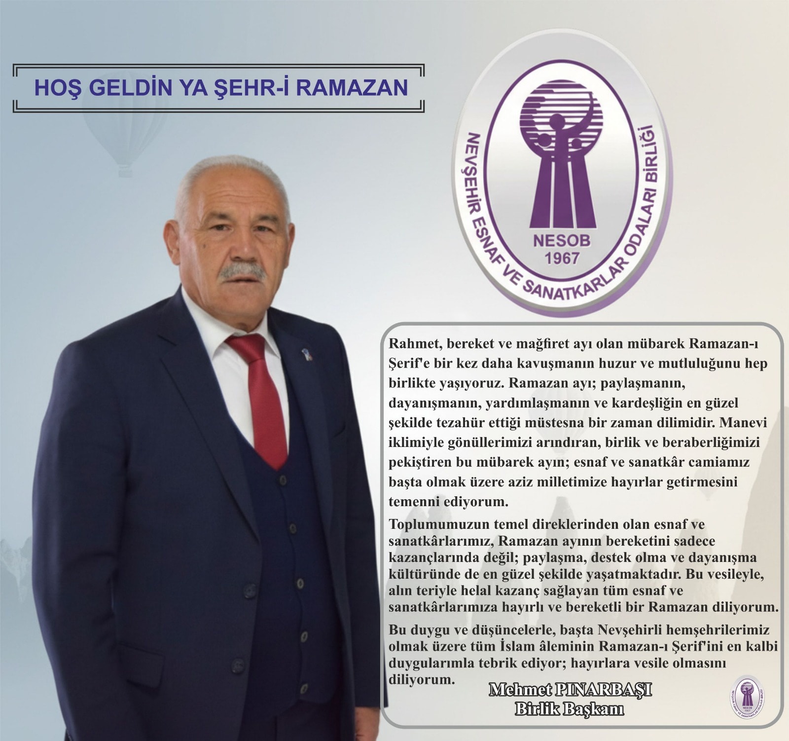 Nevşehir Esnaf ve Sanatkârlar Odaları Birliği Başkanı Mehmet Pınarbaşı, Ramazan-ı Şerif dolayısıyla bir mesaj yayımlayarak, mübarek ayın esnaf camiası başta olmak üzere tüm İslam âlemine hayırlar getirmesini temenni etti.