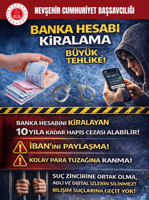 Nevşehir Cumhuriyet Başsavcısı Durmuş Ali Karakoca, son dönemde özellikle gençleri hedef alan banka hesabı kiralama girişimlerine karşı önemli uyarılarda bulundu. Karakoca, “Kolay para”, “Sadece hesabını ver”, “Sorumluluk bizde” gibi vaatlerle vatandaşların kandırıldığını belirterek, bu yöntemin dolandırıcılık ve kara para aklama suçlarının merkezinde yer aldığını vurguladı.