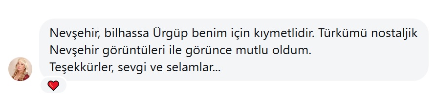 “Nevşehir, bilhassa Ürgüp benim için çok kıymetlidir. Türkümü nostaljik Nevşehir görüntüleri ile görünce mutlu oldum. Teşekkürler, sevgi ve selamlar…”