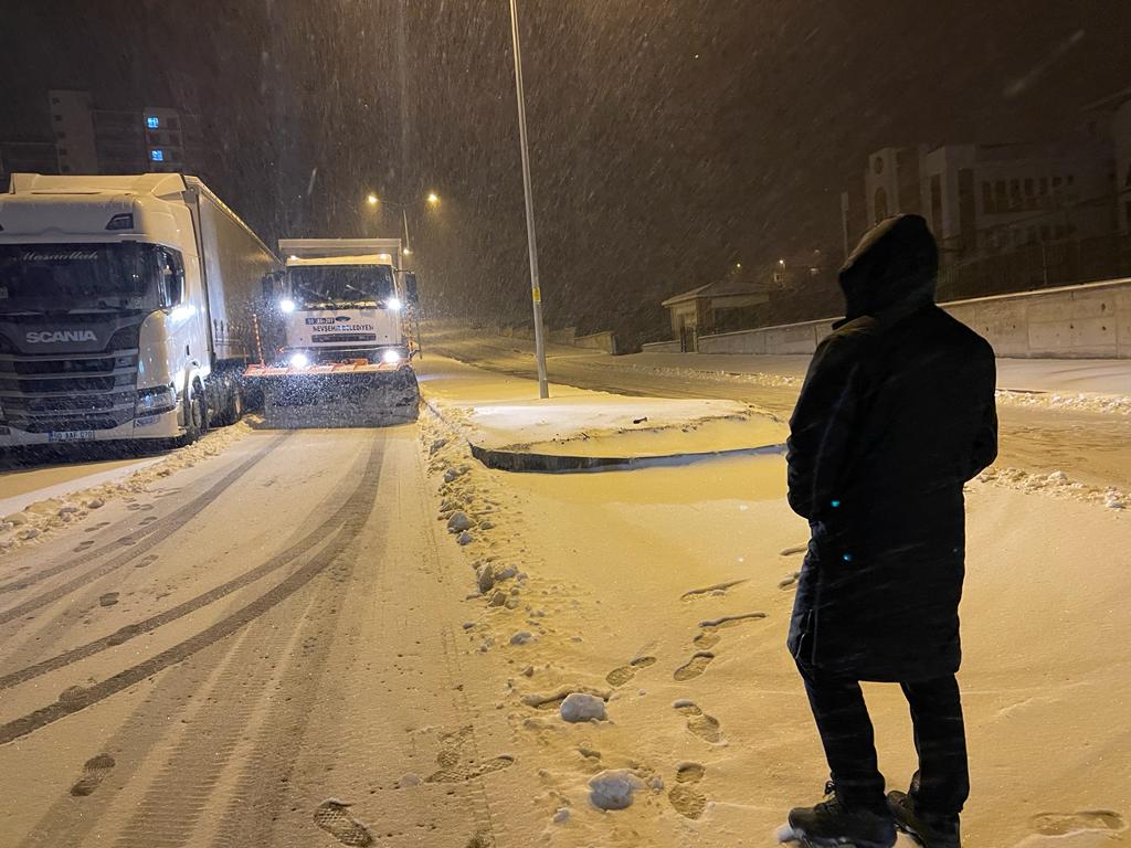 Kar küreme araçları ve iş makineleri ile sorunlu bölgelere kısa sürede müdahale eden ekipler, özellikle gece saatlerinde yaşanabilecek buzlanma tehlikesine karşı sürücüleri dikkatli olmaları konusunda uyardı.