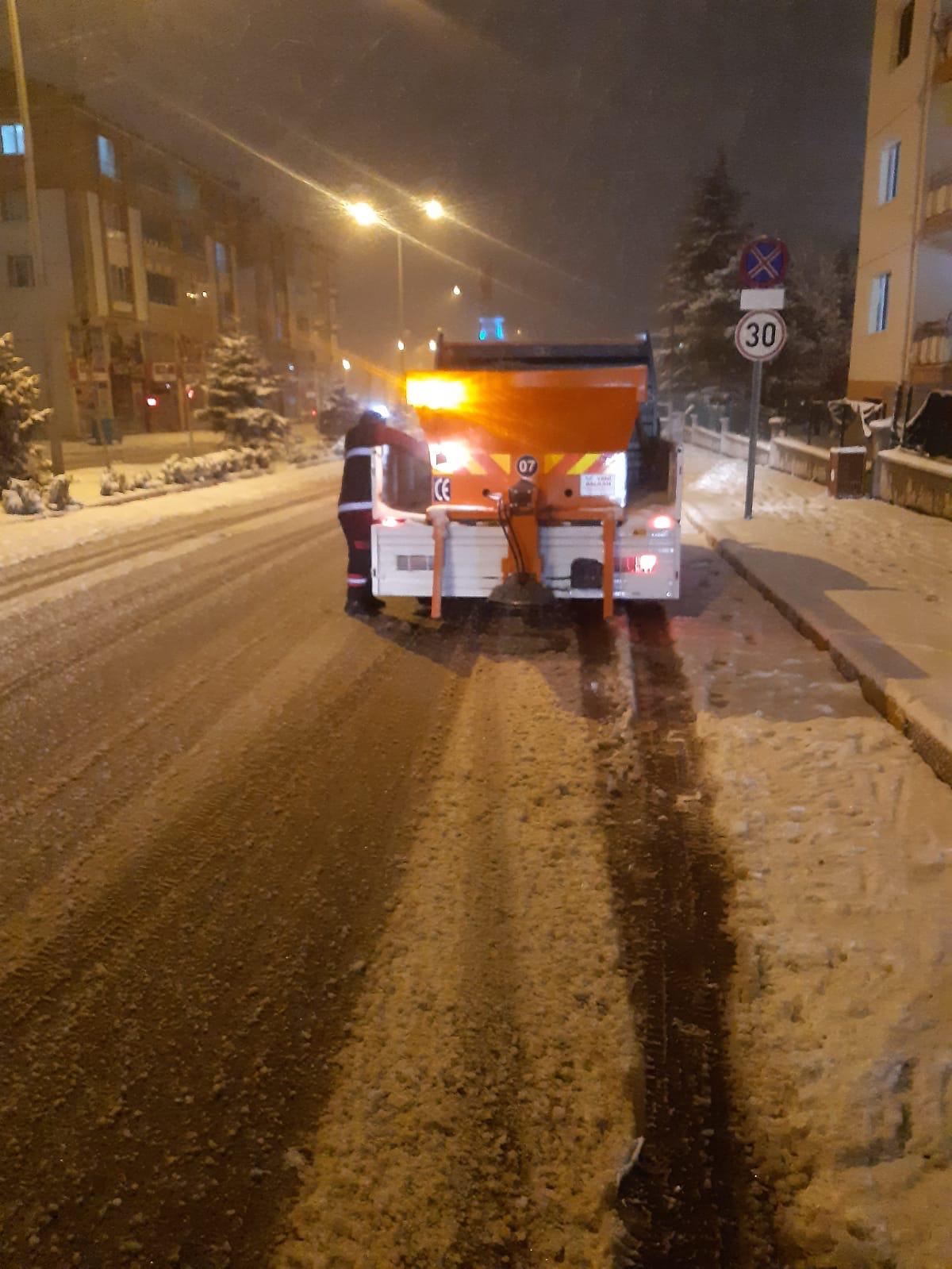 Kar yağışının meydana getirdiği olumsuzlukları ortadan kaldırmak ve şehirdeki günlük yaşamın aksamaması için öncelikle araç ve yaya trafiğinin yoğun olduğu bölgeler olmak üzere tüm mahallelerde karla mücadele çalışmalarını aralıksız sürdüren belediye ekipleri, kepçe ve greyderlerle karları temizlerken bir yandan da buzlanmanın önlenmesi için yollarda tuzlama çalışması yapıyor.