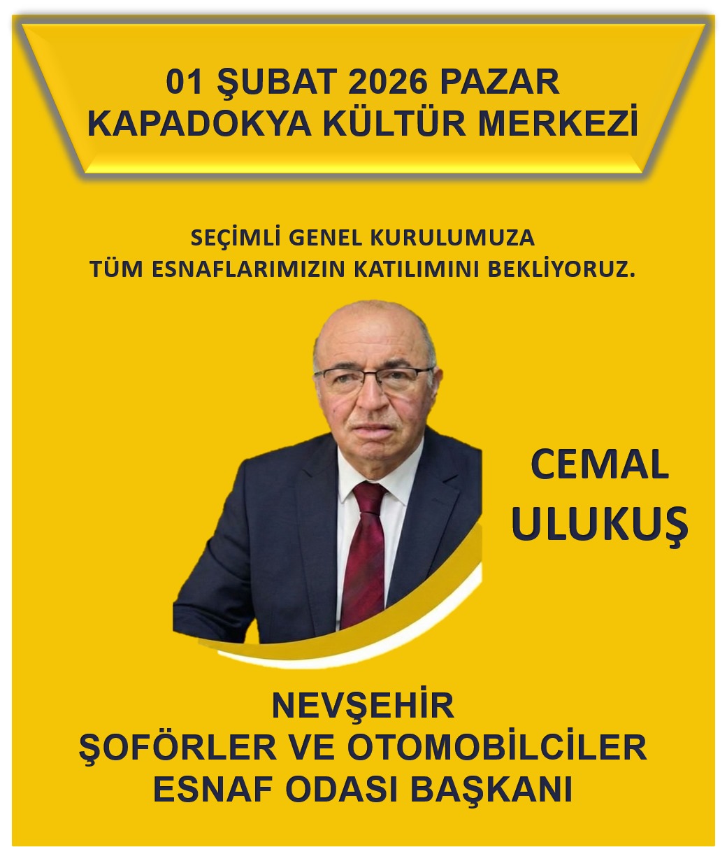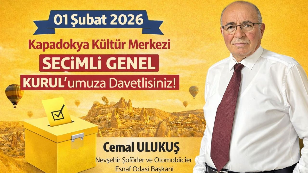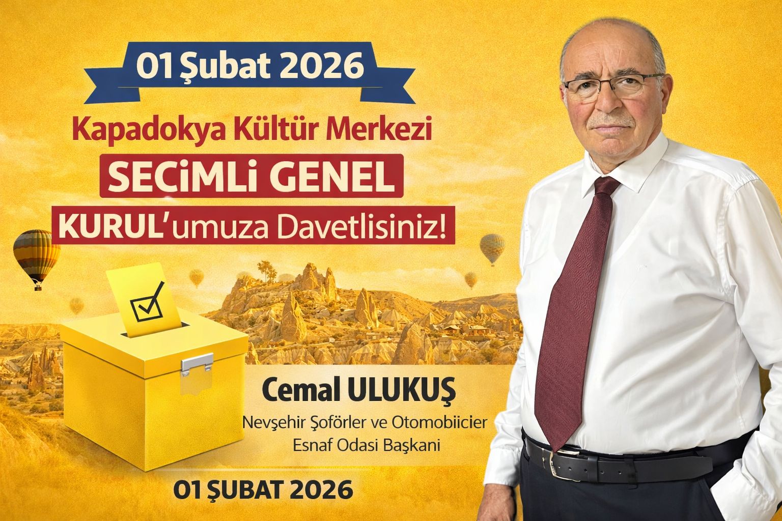 Nevşehir Şoförler ve Otomobilciler Esnaf Odası, olağan genel kurul toplantısını 01 Şubat 2026 Pazar günü gerçekleştirecek. Kapadokya Kültür Merkezi’nde saat 10.00’da yapılacak genel kurul öncesinde, Oda Başkanı Cemal Ulukuş, tüm üyeleri birlik ve beraberlik mesajıyla genel kurula davet etti.