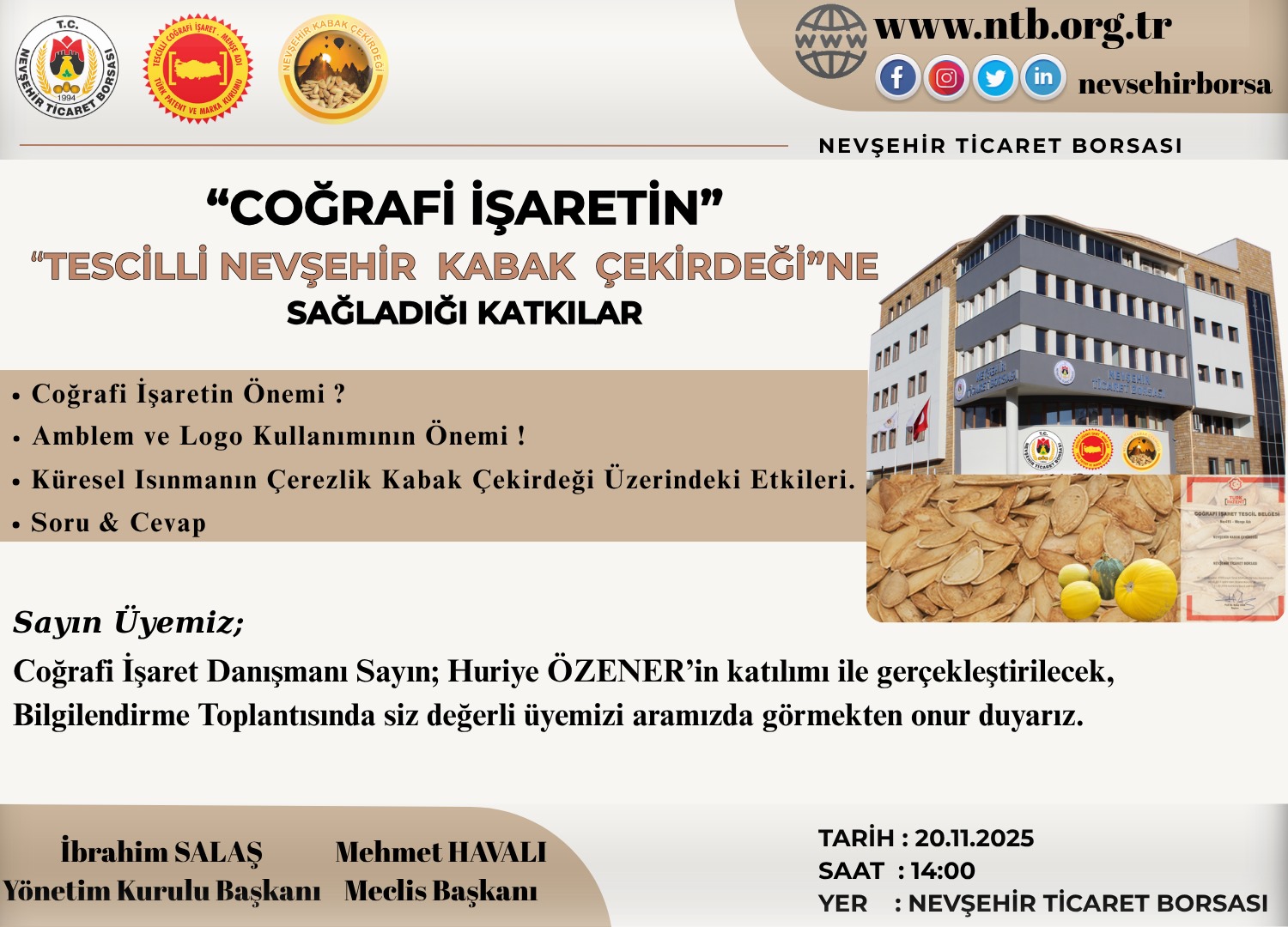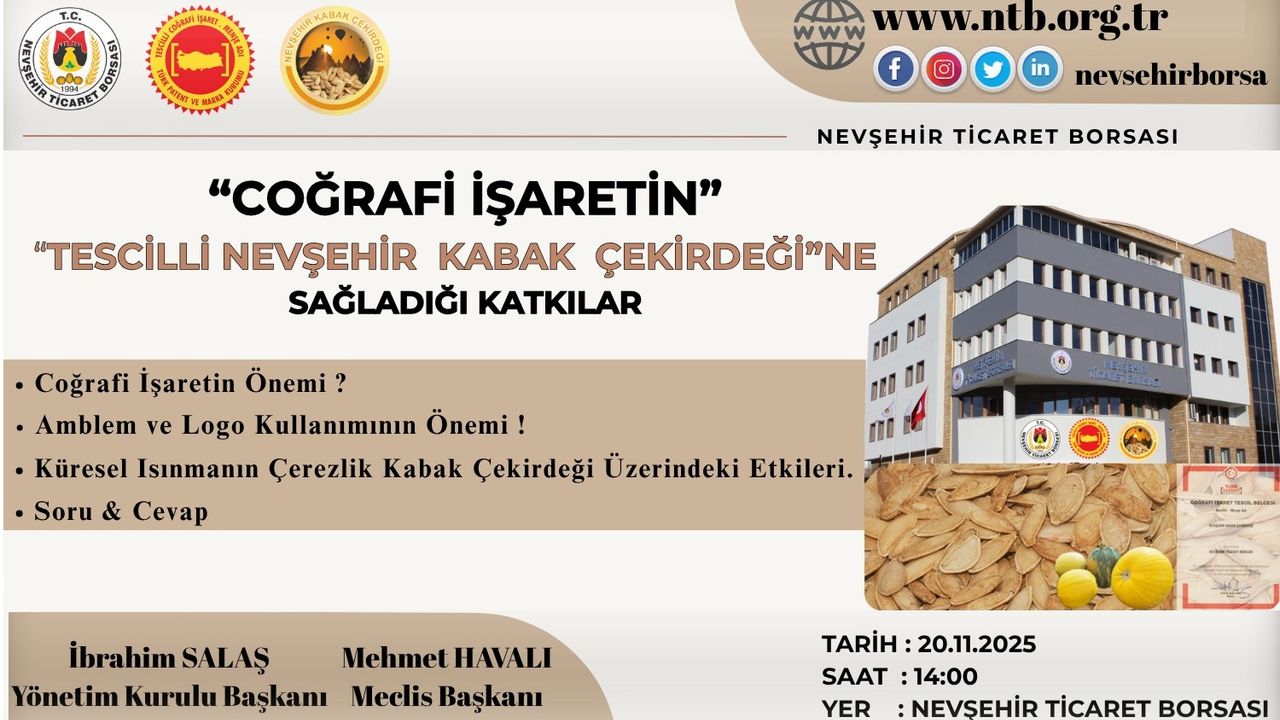 Nevşehir Ticaret Borsası tarafından, “Coğrafi İşaretin Tescilli Nevşehir Kabak Çekirdeğine Sağladığı Katkılar” konulu bilgilendirme toplantısı düzenlenecek. Toplantıda coğrafi işaret sürecinin önemi, ürün amblem ve logo kullanımının sağladığı avantajlar ile küresel ısınmanın çerezlik kabak çekirdeği üzerindeki etkileri ele alınacak.