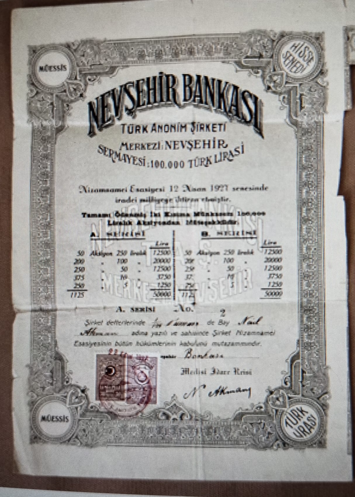 Cumhuriyetin İlk Yıllarında Nevşehir’de 2 ayrı banka vardı; "Nevşehir Bankası T.A.Ş ve Ürgüp Zürra Ve Tüccar Bankası T.A.Ş"