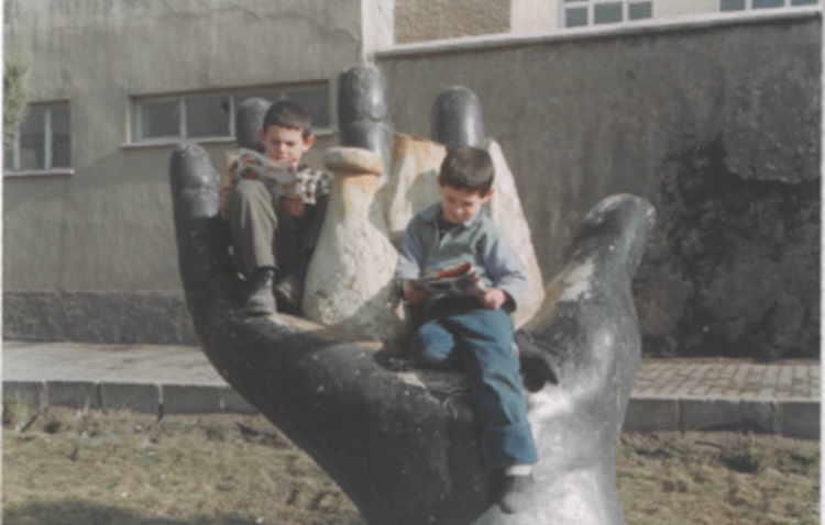 Eski Gazi Okulu önündeki heykelde kitap okuyan çocuklar.