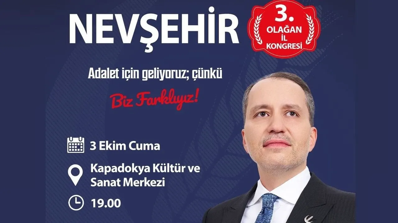 Yeniden Refah Partisi Nevşehir İl Başkanlığı’nın 3. Olağan Kongresi, Genel Başkan Dr. Fatih Erbakan’ın katılımıyla 3 Ekim Cuma günü gerçekleştirilecek. Kongre, Kapadokya Kültür ve Sanat Merkezi’nde saat 19.00’da başlayacak.