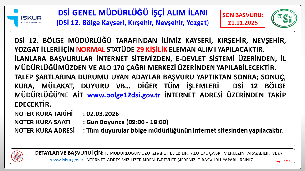 Devlet Su İşleri (DSİ) 12. Bölge Müdürlüğü, Nevşehir, Kayseri, Kırşehir ve Yozgat illerinde görevlendirmek üzere 29 daimi işçi alımı gerçekleştirecek. Başvurular İŞKUR internet sitesi, e-Devlet, ALO 170 ve DSİ 12. Bölge Müdürlüğü üzerinden yapılabilecek.