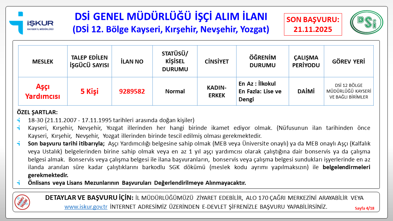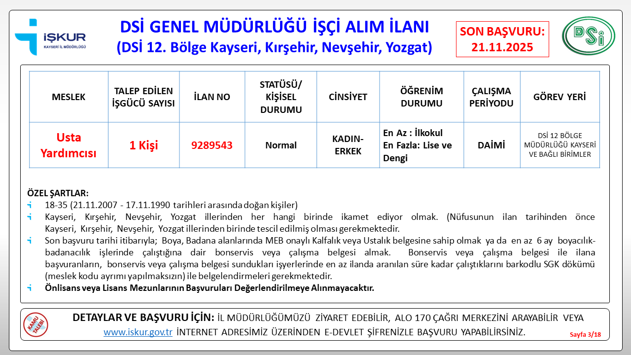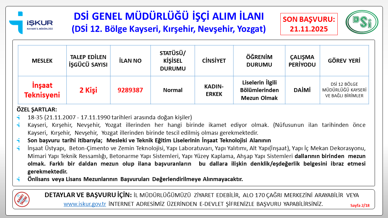 Yetkililer, başvuru süreci ve gerekli şartlarla ilgili detaylı bilgilerin DSİ 12. Bölge Müdürlüğü ve İŞKUR üzerinden takip edilebileceğini belirtti.