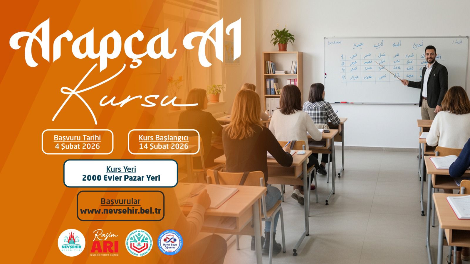 Arapça A1 Kursu; 04 Şubat 2026 tarihinde alınmaya başlayacak olan başvurular sonrası kurs 14 Şubat 2026 tarihinde başlayıp 24 Mayıs 2026 tarihinde tamamlanacak. Kurs Cumartesi günleri 13.00 - 17.00 saatleri arasında 2000 Evler Pazaryeri kurs biriminde yapılacak.