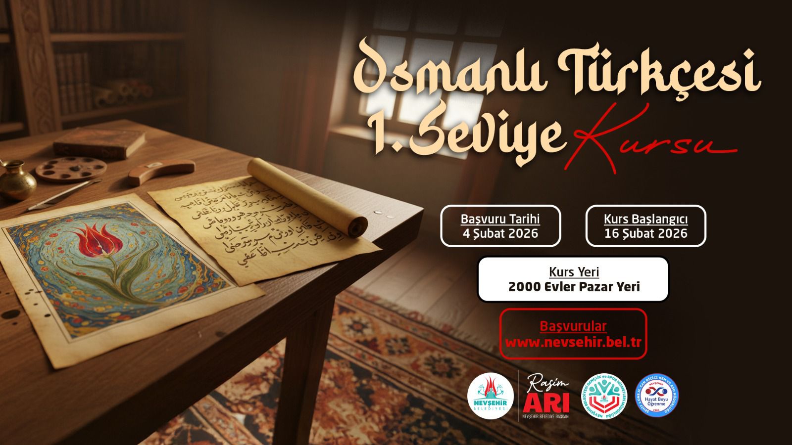 Osmanlı Türkçesi 1. Seviye Kursu; 04 Şubat 2026 tarihinde alınmaya başlanacak olan başvurular sonrası kurs 16 Şubat 2026 tarihinde başlayıp 30 Mart 2026 tarihinde tamamlanacak. Kurs Pazartesi ve Salı günleri 13.00 - 17.00 saatleri arasında 2000 Evler Pazaryeri kurs biriminde yapılacak.