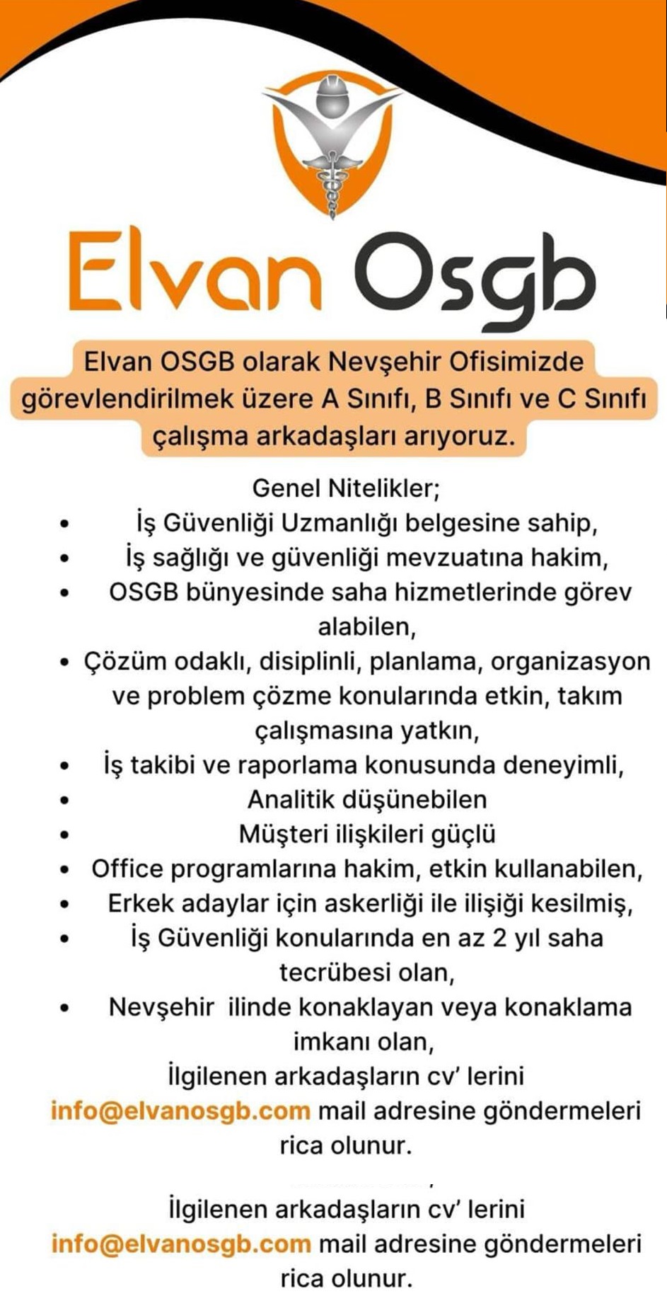 Elvan OSGB, Nevşehir ofisinde görevlendirilmek üzere A, B ve C Sınıfı İş Güvenliği Uzmanı çalışma arkadaşları aradığını duyurdu.