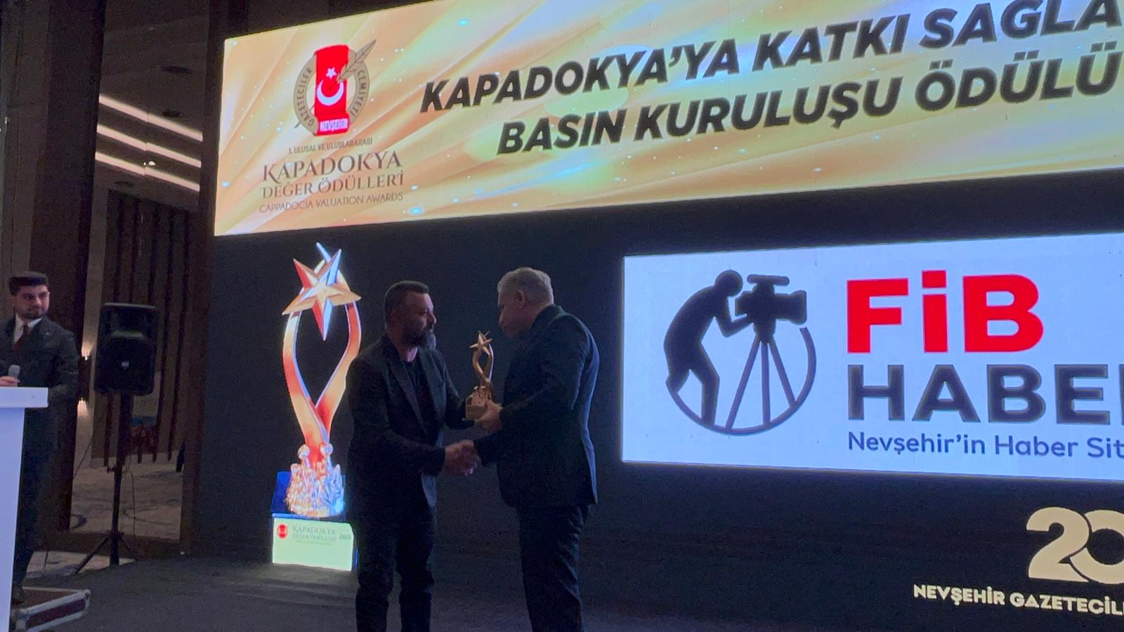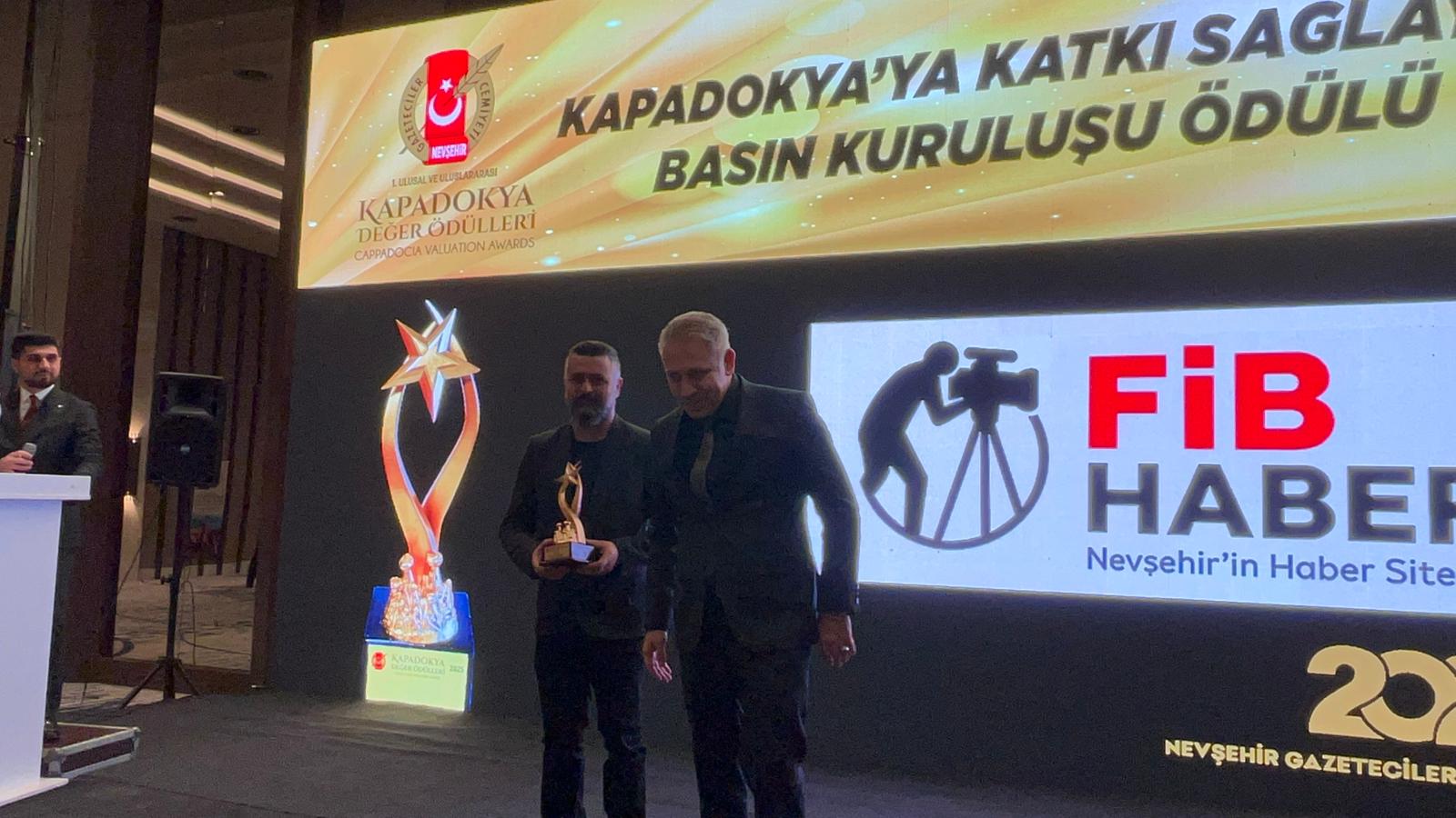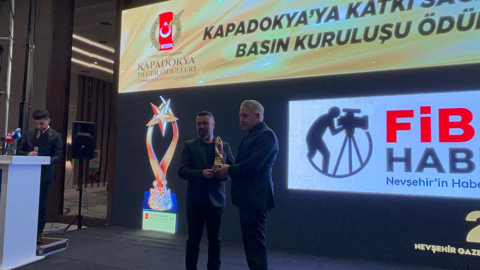 Kapadokya Değer Ödülleri'nin takdim edildiği programda, “Kapadokya’ya Katkı Sağlayan Basın Kuruluşu Ödülü” FİB Haber.com İmtiyaz Sahibi Gazeteci İbrahim Uysal, Nevşehir İl Emniyet Müdürü Serkan Karaman'ın elinden aldı.