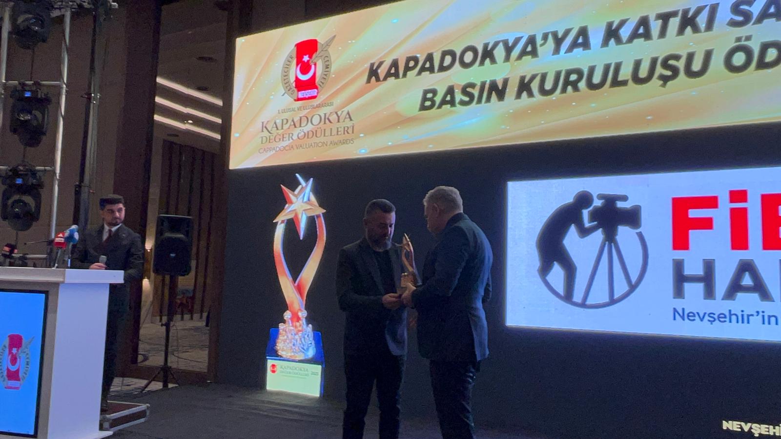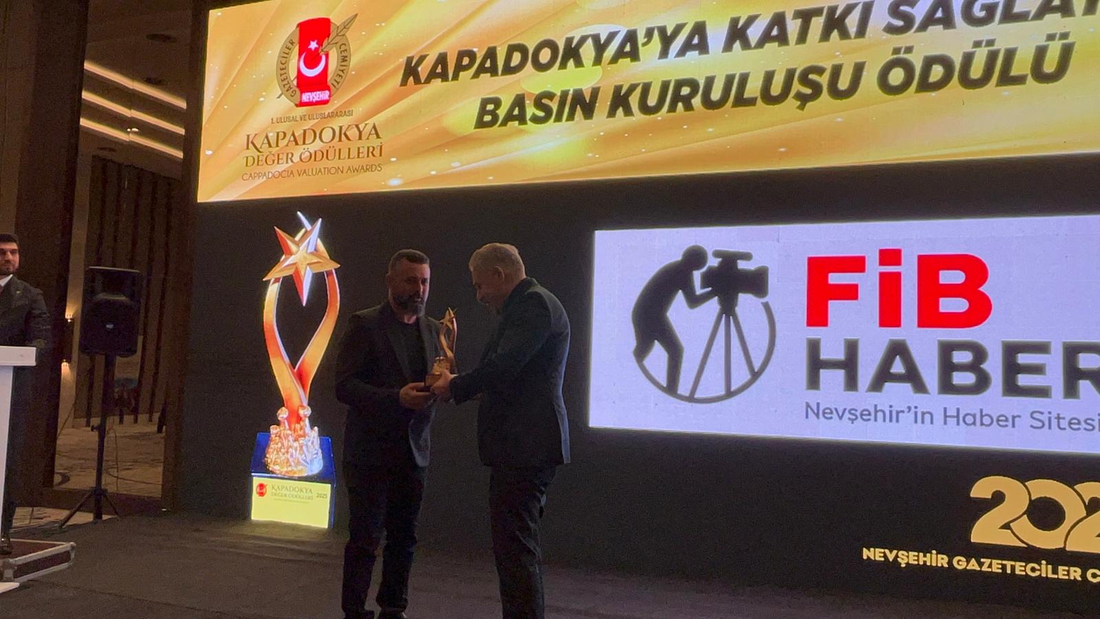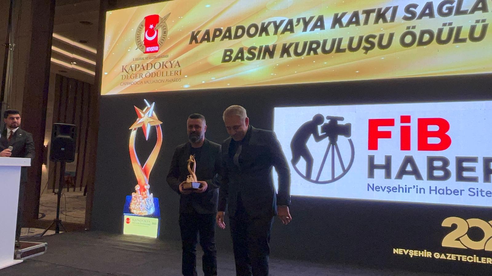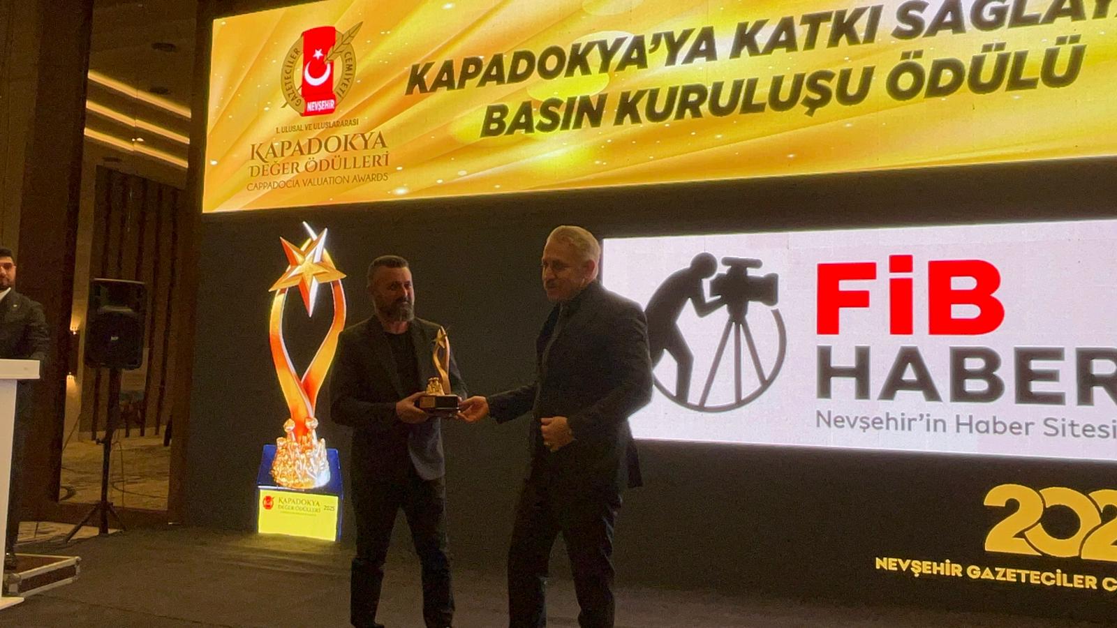 Kapadokya Değer Ödülleri'nin takdim edildiği programda, “Kapadokya’ya Katkı Sağlayan Basın Kuruluşu Ödülü” FİB Haber.com İmtiyaz Sahibi Gazeteci İbrahim Uysal, Nevşehir İl Emniyet Müdürü Serkan Karaman'ın elinden aldı.