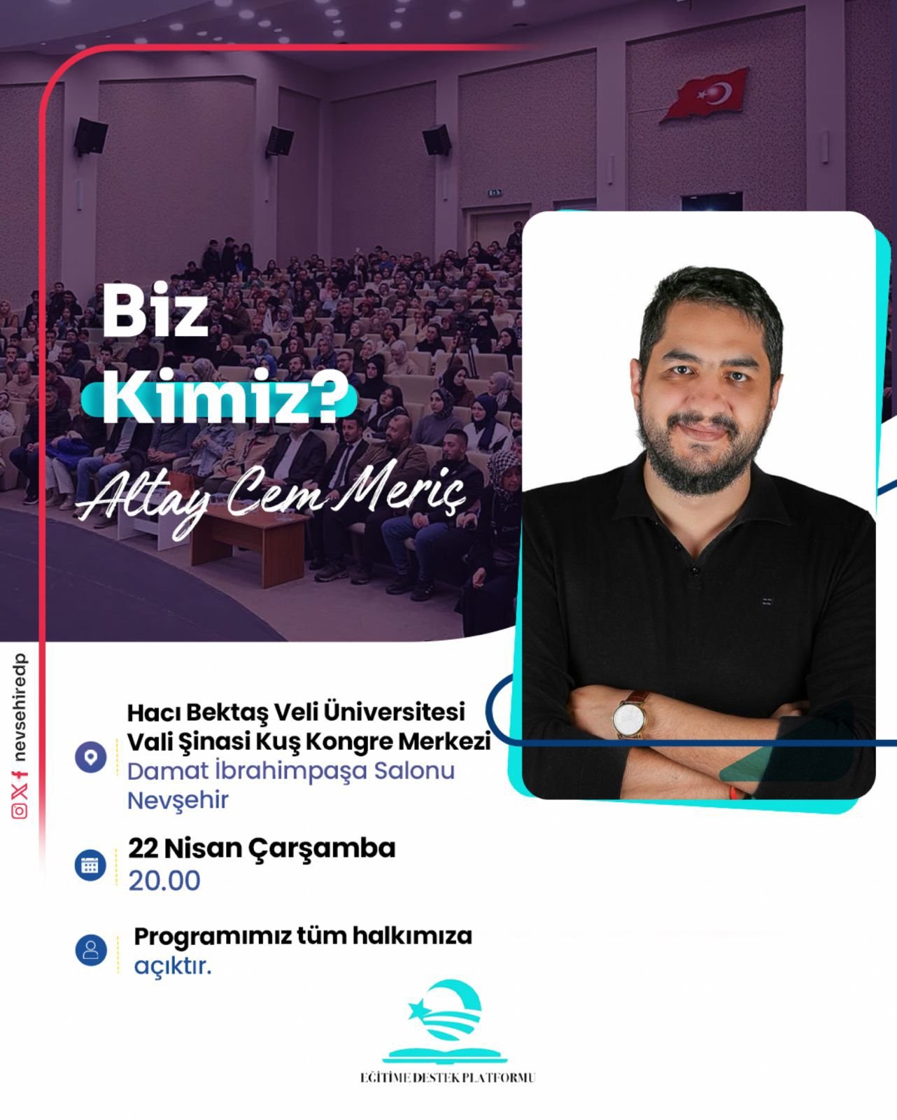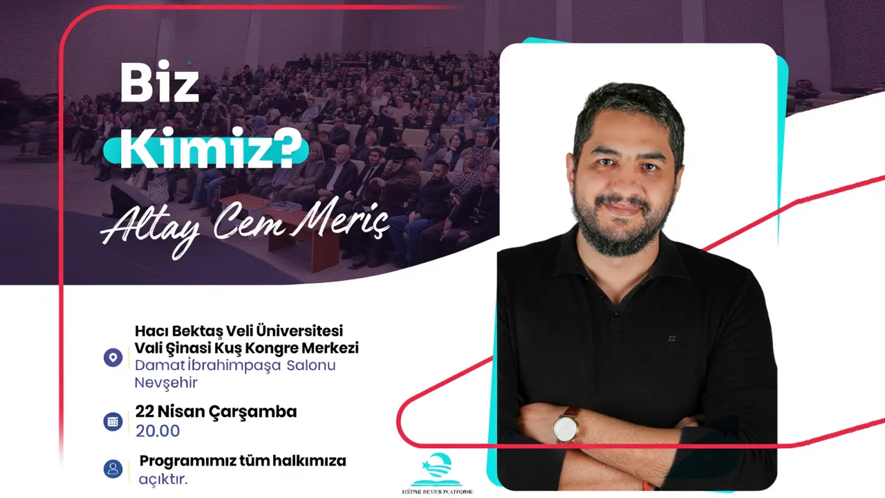 Eğitime Destek Platformu tarafından organize edilen etkinlik kapsamında Altay Cem Meriç, “Biz Kimiz?” başlıklı söyleşide katılımcılarla buluşacak. Programda; kimlik, inanç, düşünce dünyası ve günümüz gençliğinin karşı karşıya olduğu sorular üzerine kapsamlı değerlendirmelerde bulunulması bekleniyor.