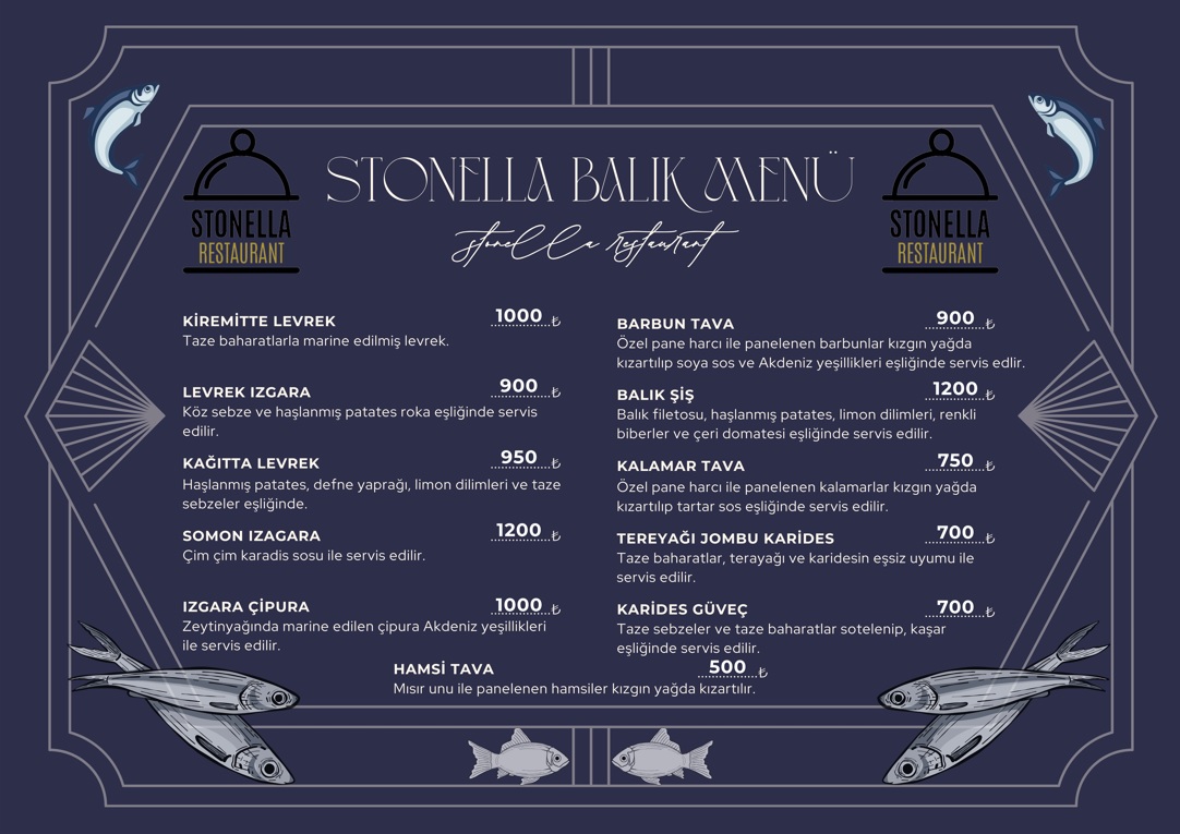 Stonella Balık Menüsü ise öne çıkan seçenekler şöyle: