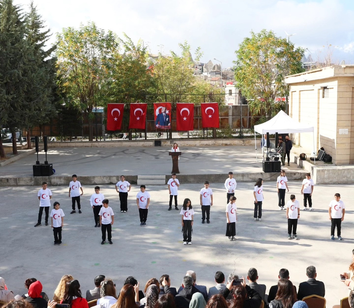 Resmî tören ise Göreme İlkokulu bahçesinde düzenlendi. Törene Göreme Belediye Başkanı Ömer Eren, Belediye Meclis Üyeleri, öğretmenler, öğrenciler ve çok sayıda vatandaş katıldı. Tören, saygı duruşu ve İstiklâl Marşı’nın okunmasının ardından başladı.
