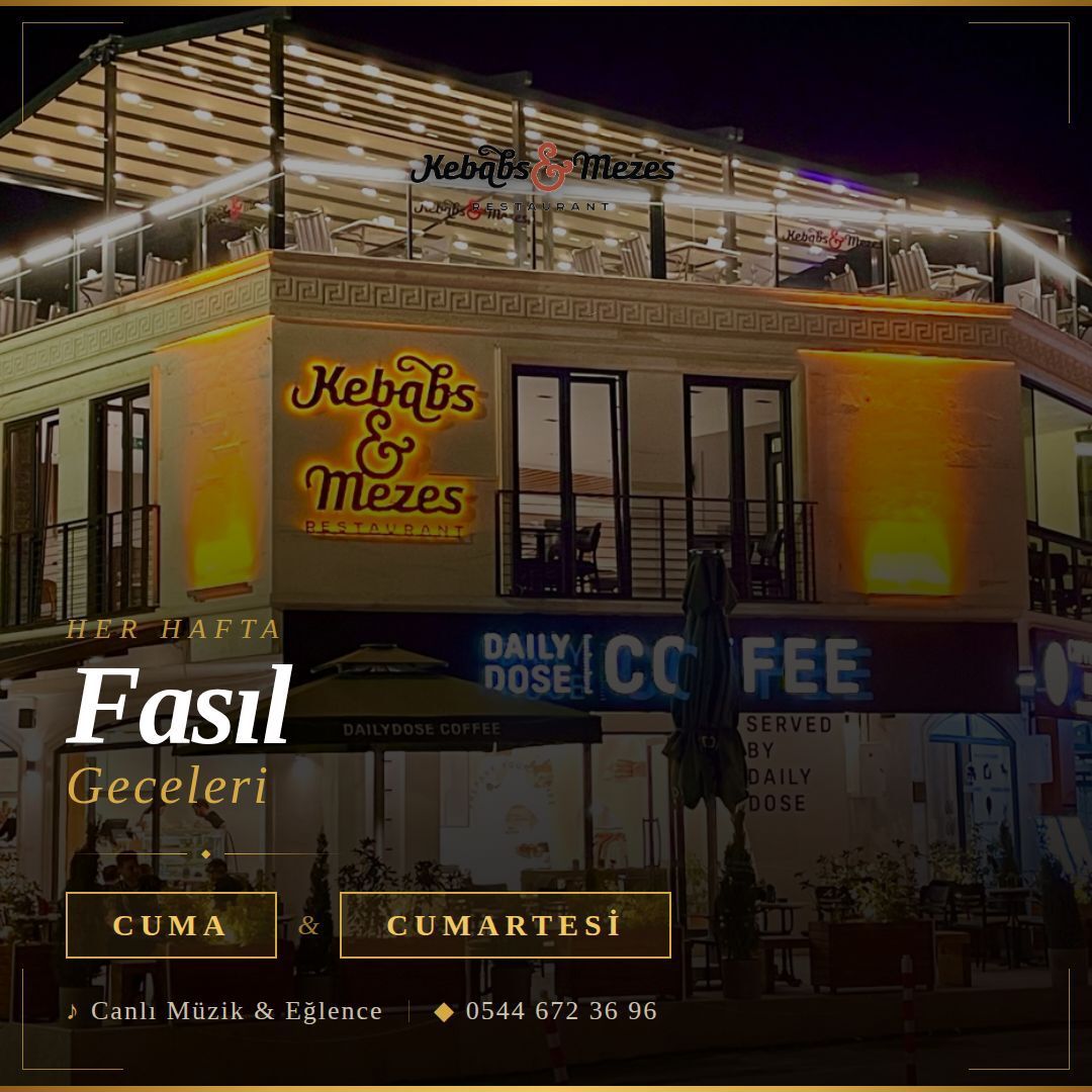 Restoran, geleneksel Türk müziğinin en güzel örneklerini sunan fasıl ekibi ile birlikte, eşsiz kebaplar ve zengin meze çeşitlerini bir araya getirerek unutulmaz bir gastronomi deneyimi sunuyor. Misafirler, hem lezzetli yiyeceklerin tadını çıkarıyor hem de canlı müzikle keyifli dakikalar geçiriyor.