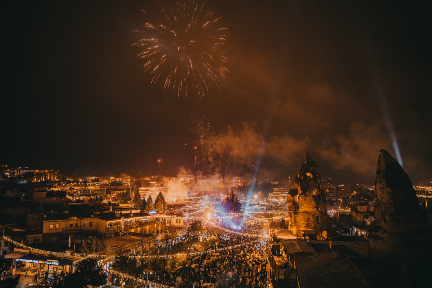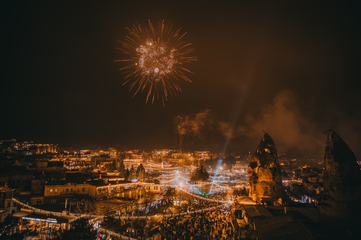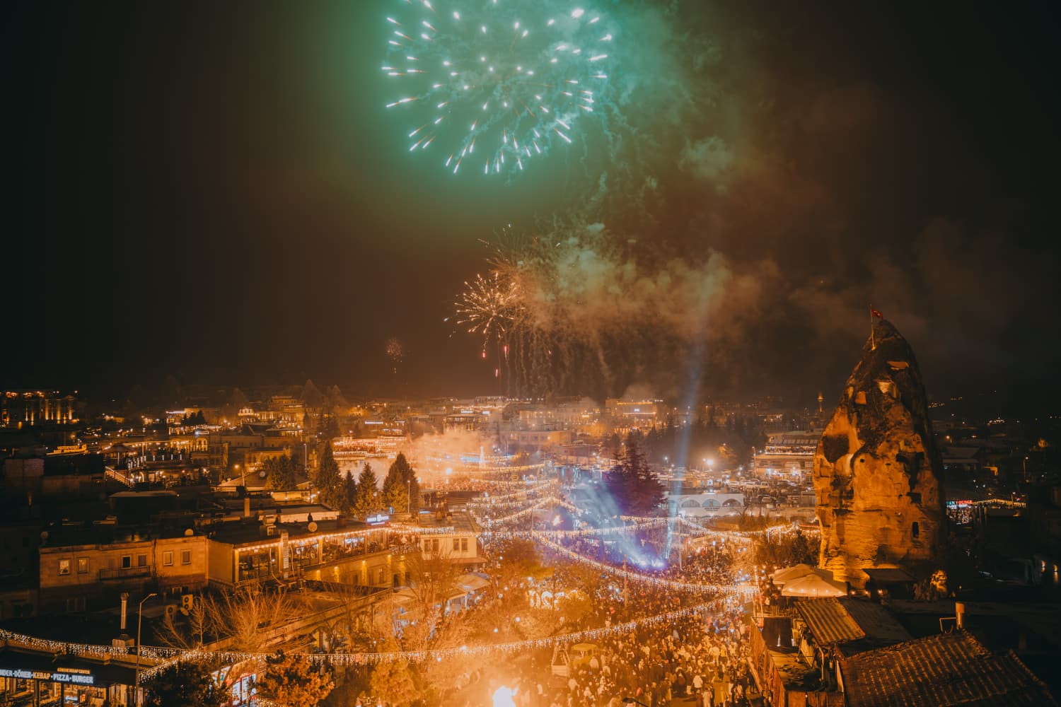 Kapadokya’nın kalbi Nevşehir'in merkez ilçeye bağlı Göreme beldesi, 2026 yılına unutulmaz bir yılbaşı gecesiyle girdi. Yerli ve yabancı binlerce ziyaretçinin akın ettiği Göreme Meydanı, yeni yıl gecesinde adeta dev bir festival alanına dönüştü.
