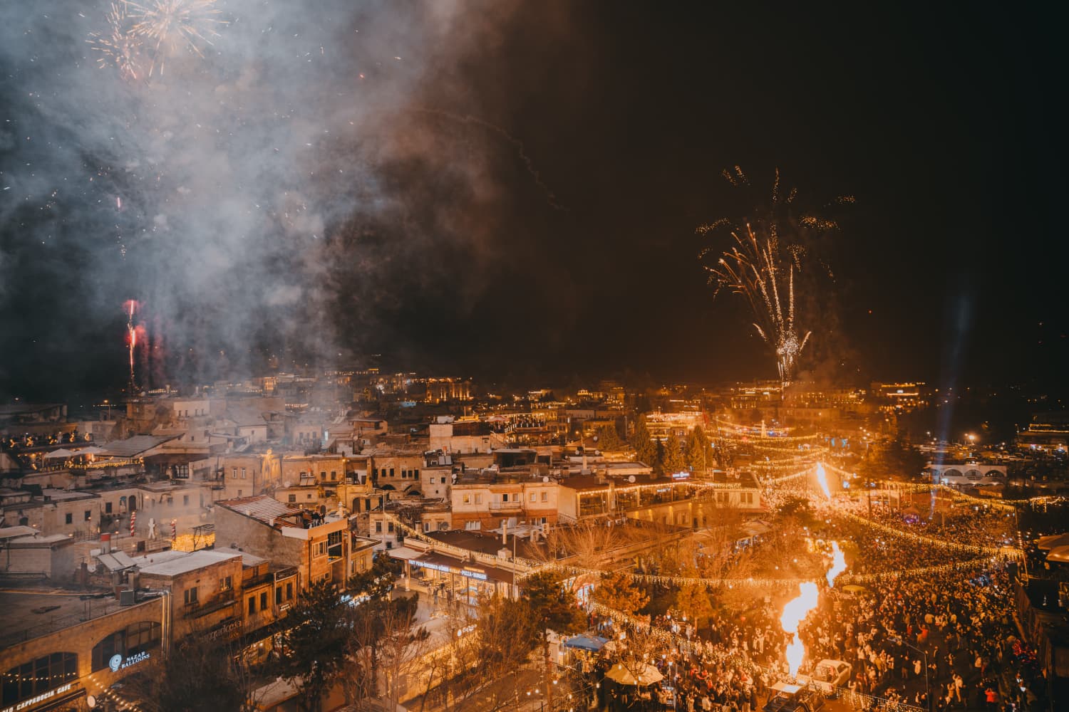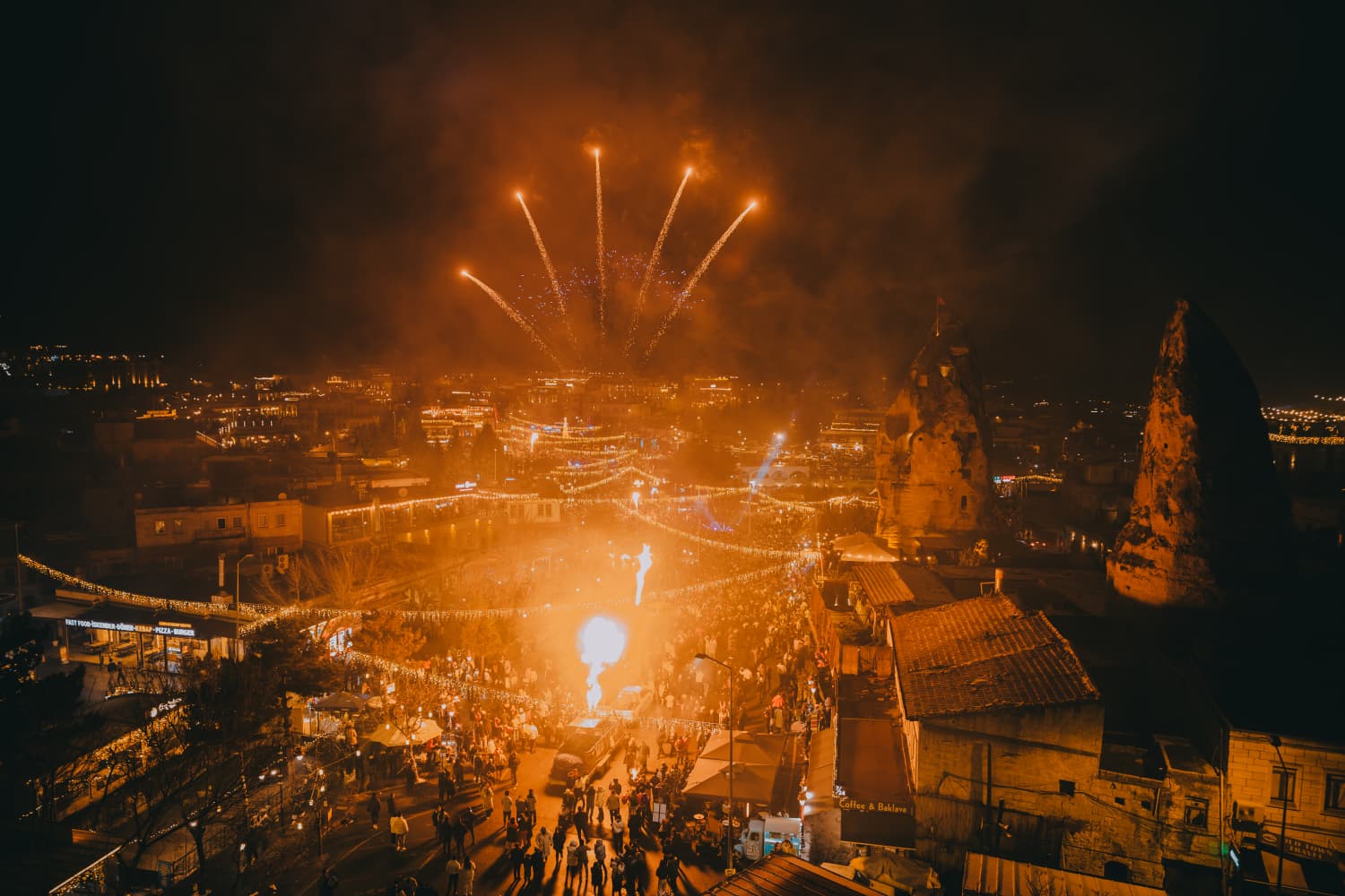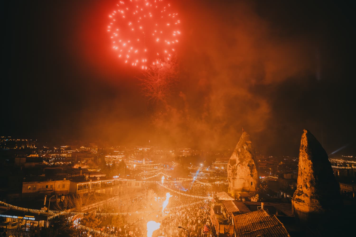 Kapadokya’nın kalbi Nevşehir'in merkez ilçeye bağlı Göreme beldesi, 2026 yılına unutulmaz bir yılbaşı gecesiyle girdi. Yerli ve yabancı binlerce ziyaretçinin akın ettiği Göreme Meydanı, yeni yıl gecesinde adeta dev bir festival alanına dönüştü.