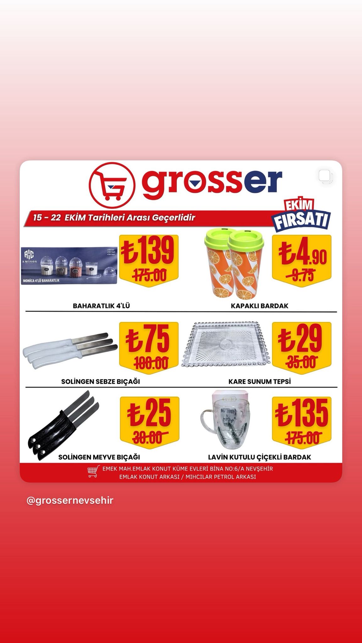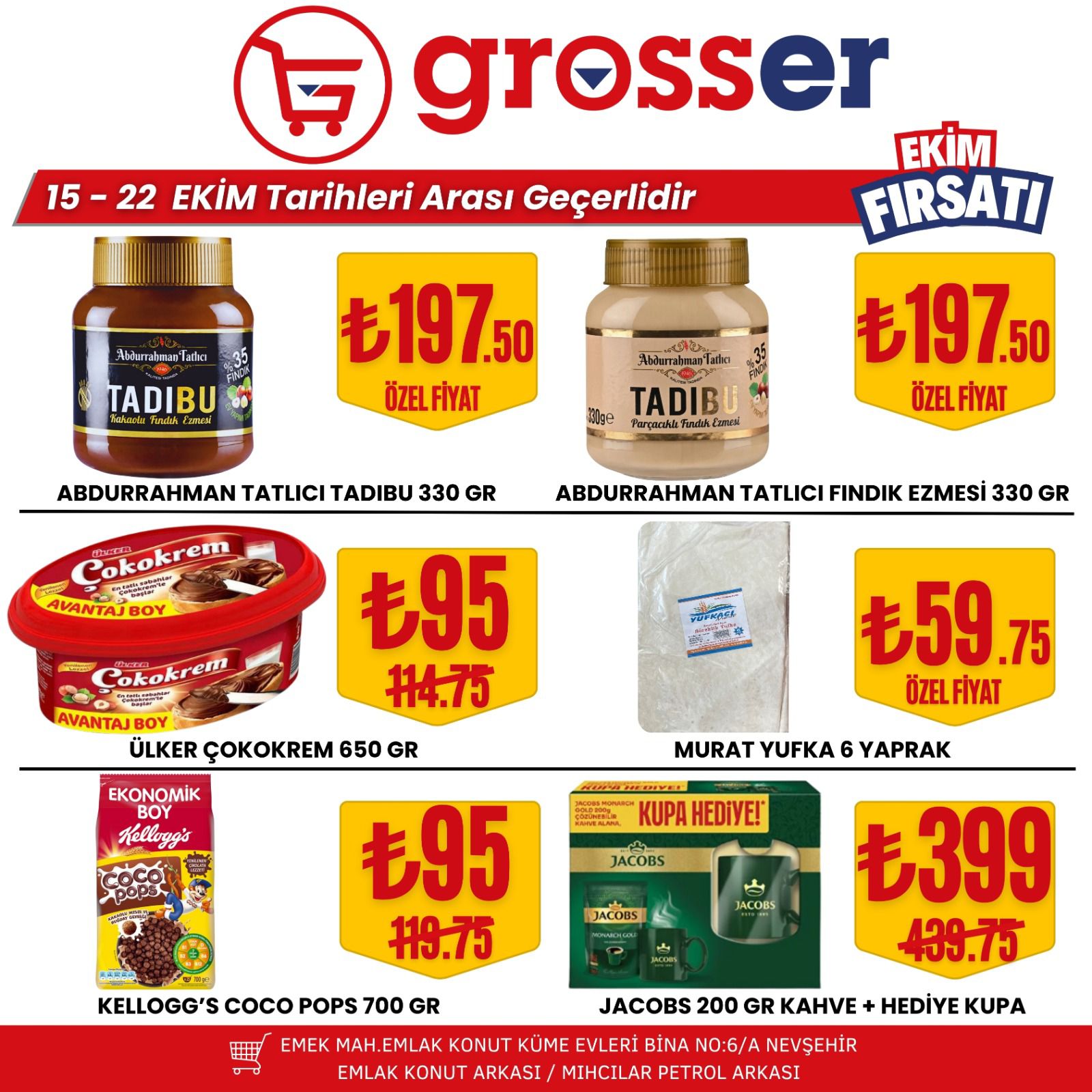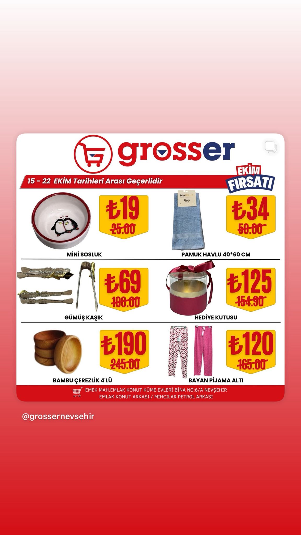 Nevşehir'de müşterilerine geniş ürün yelpazesi sunan Grosser Market, 15-22 Ekim 2025 tarihleri arasında geçerli fırsat ürünlerinde kaçırılmayacak size özel fiyatlar sizleri bekliyor...