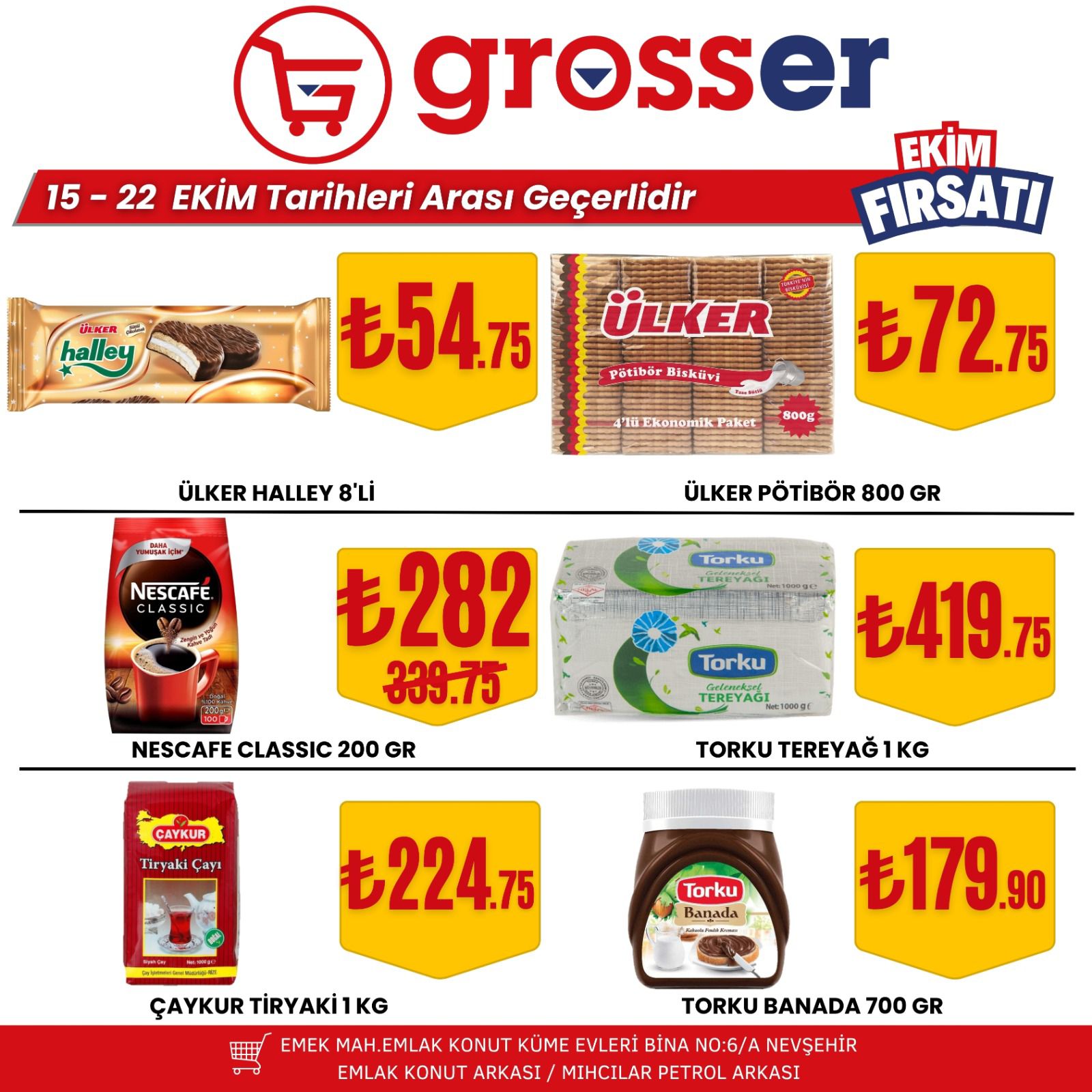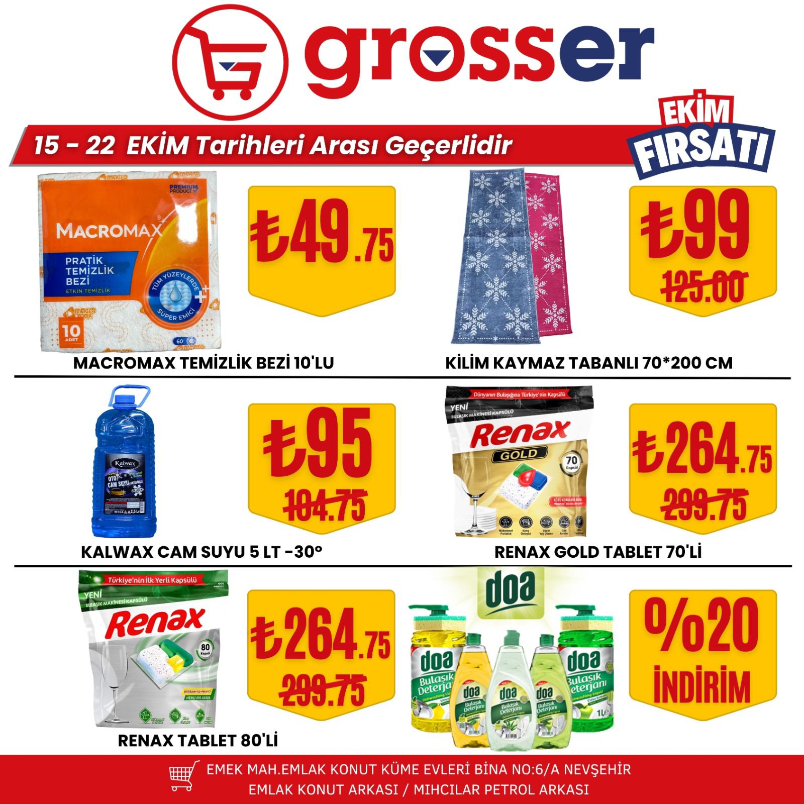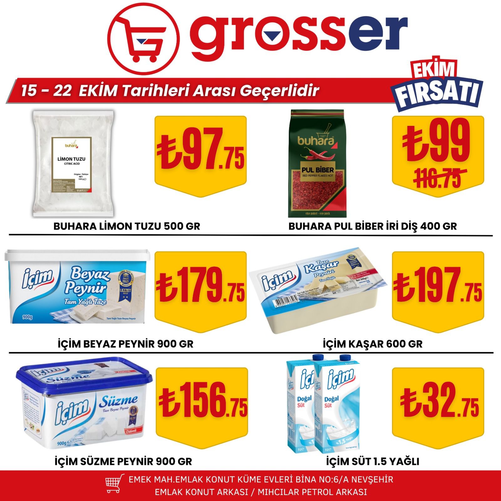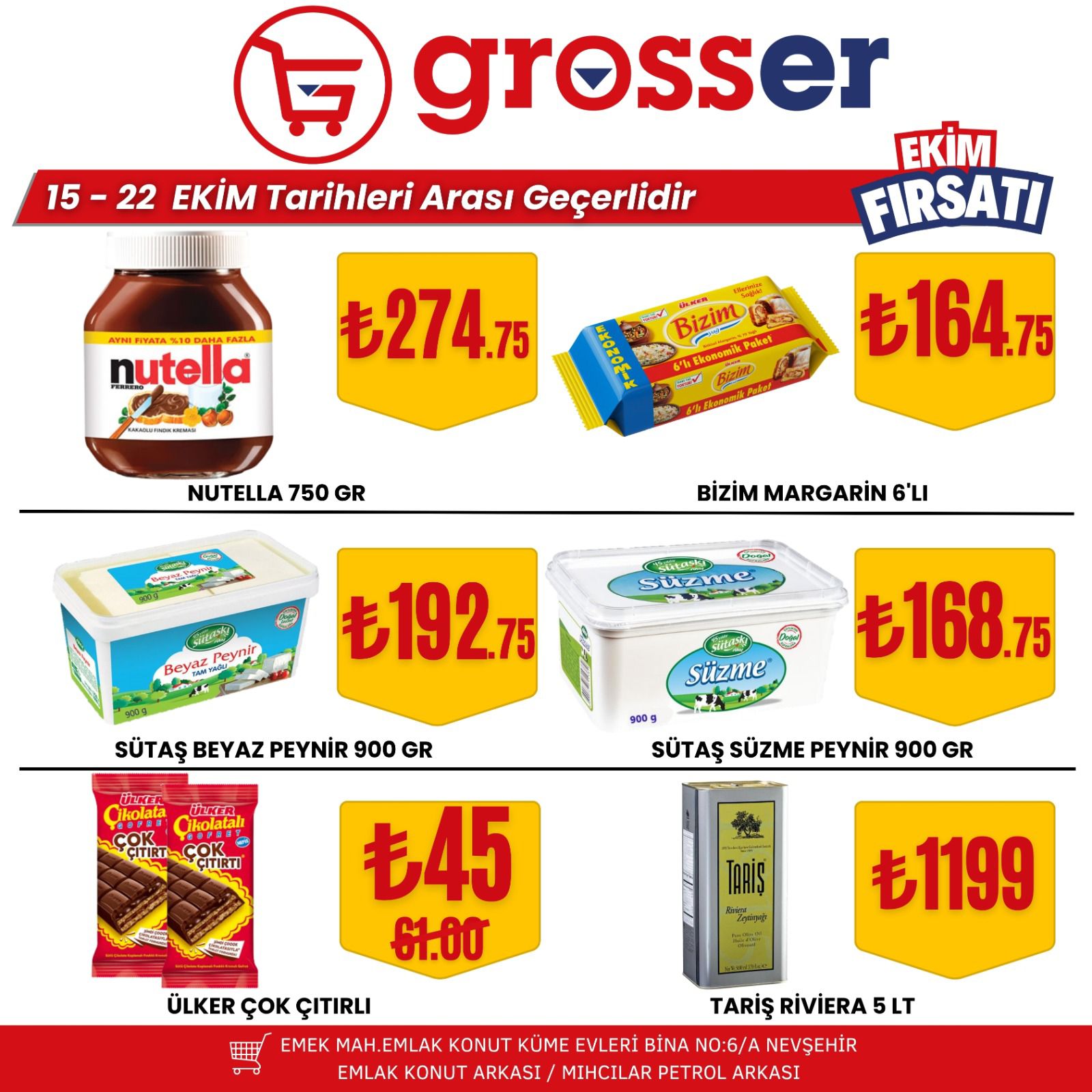 Nevşehir'de müşterilerine geniş ürün yelpazesi sunan Grosser Market, 15-22 Ekim 2025 tarihleri arasında geçerli fırsat ürünlerinde kaçırılmayacak size özel fiyatlar sizleri bekliyor...