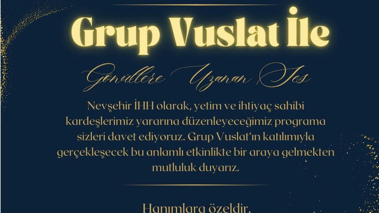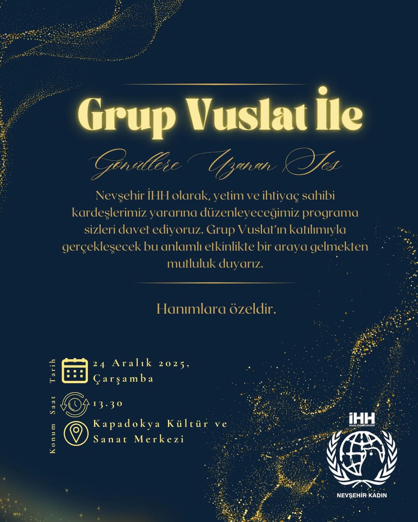 Nevşehir İHH, yetim ve ihtiyaç sahibi vatandaşlara destek olmak amacıyla anlamlı bir etkinliğe imza atıyor. Hayır ve dayanışma ruhunu ön plana çıkaran program, Grup Vuslat’ın katılımıyla 24 Aralık 2025 Çarşamba günü Nevşehir’de gerçekleştirilecek.