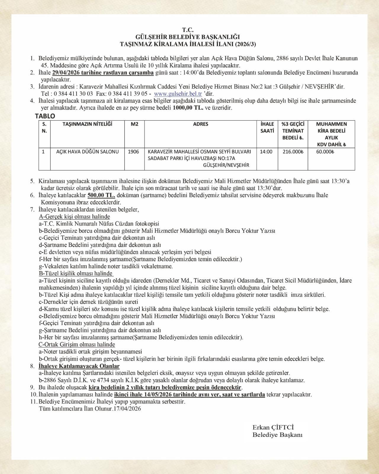 Gülşehir Belediye Başkanı Erkan Çiftci imzasıyla yayımlanan ilanda, Belediye Encümeni’nin ihaleyi yapıp yapmamakta serbest olduğu vurgulandı.