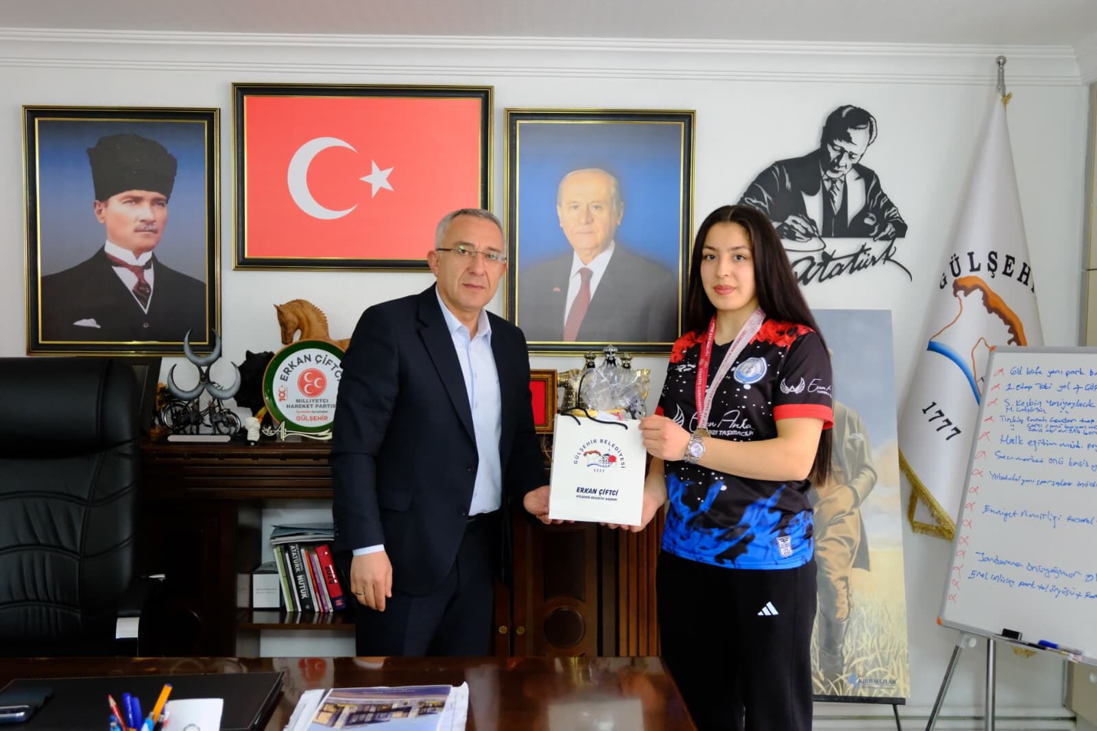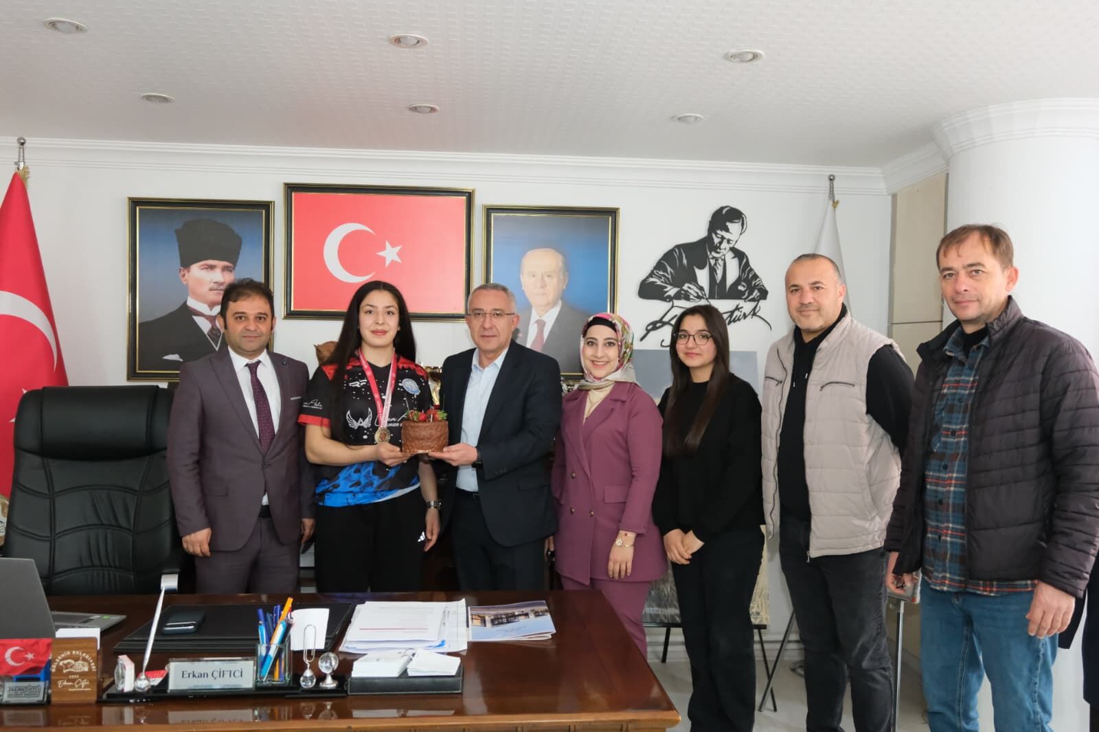 Gülşehir Şehit Ömer Halisdemir Mesleki ve Teknik Anadolu Lisesi Okul Müdürü Mustafa Mazak ve beraberindeki heyet, Belediye Başkanı Erkan Çiftci’yi doğum günü dolayısıyla makamında ziyaret etti. Ziyarette, ilçemizin gururu olan ve bilek güreşi branşında önemli dereceler elde eden Havva Nur Gülgan da hazır bulundu.