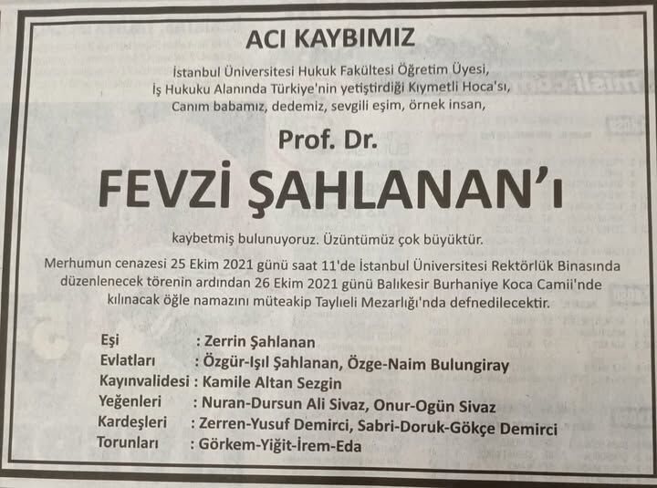 Arkadaşımı , Hukuk Fakültesi öğretim Üyesi Prof Dr Fevzi Şahlanan'ı saygıyla, özlemle anıyorum.