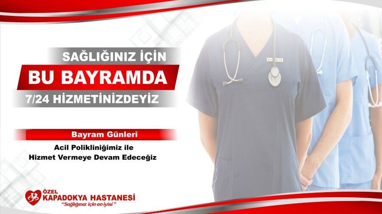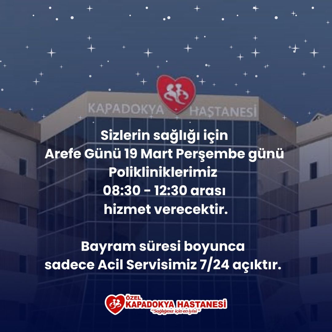Özel Kapadokya Hastanesi, yaklaşan bayram öncesi vatandaşları bilgilendirdi. Hastane yetkilileri, 19 Mart Perşembe günü Arefe Günü’nde poliklinik hizmetlerinin 08:30-12:30 saatleri arasında verileceğini açıkladı.
