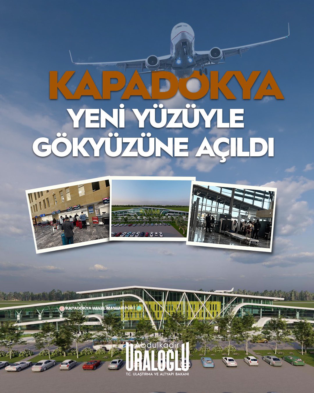 “Nevşehir Kapadokya Havalimanı Yeni Terminal Binası’nın Birinci Etabı’nda sistem test çalışmalarının tamamlanmasının ardından, bugün itibarıyla yeni terminalimizi hizmete aldık. İç ve dış hat giden yolcu salonlarını kapsayan birinci etapta operasyonel aktarım planlanan takvim doğrultusunda başarıyla gerçekleştirilmiş; mevcut terminalde sürdürülen yolcu operasyonları yeni terminal binasına taşınmıştır.