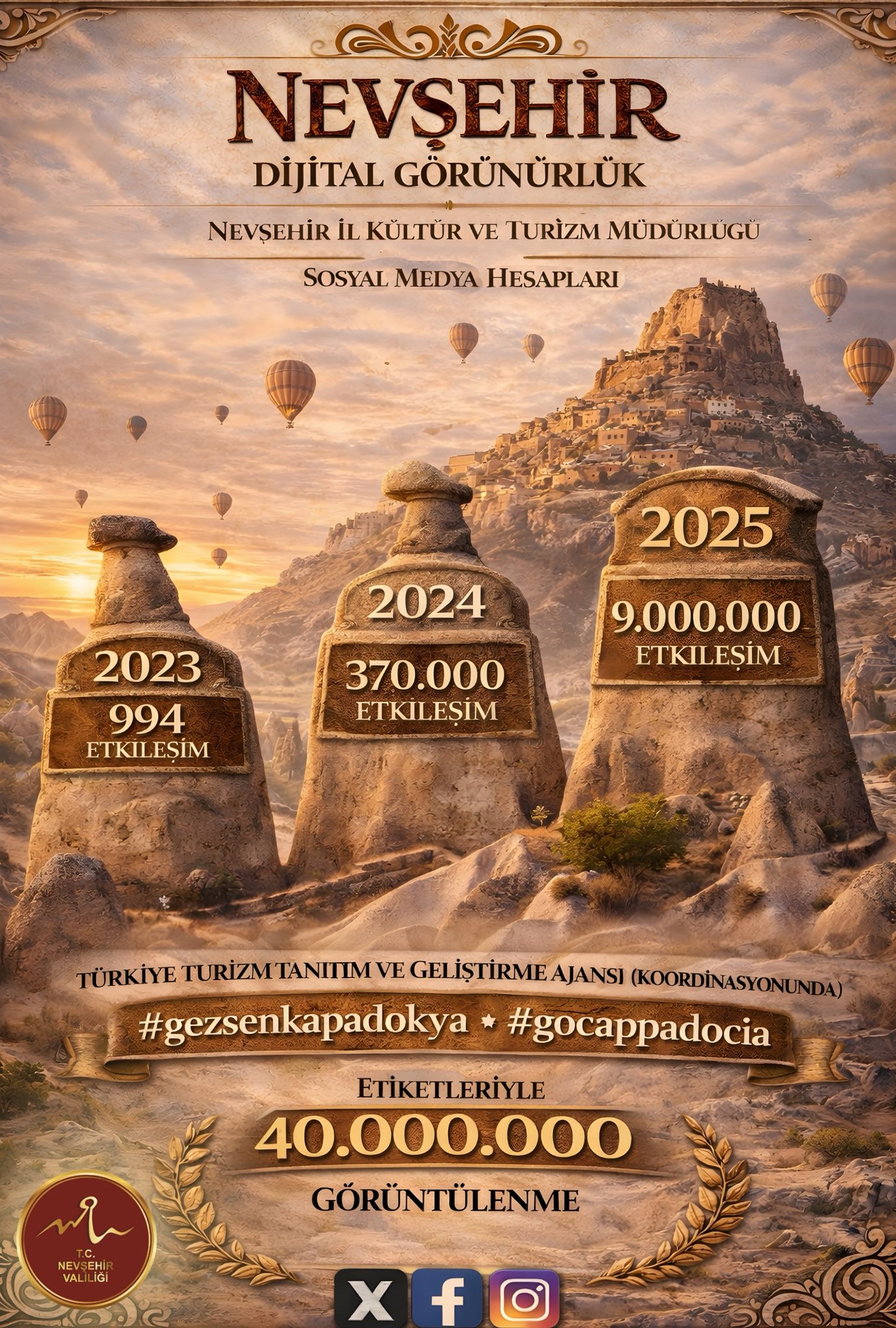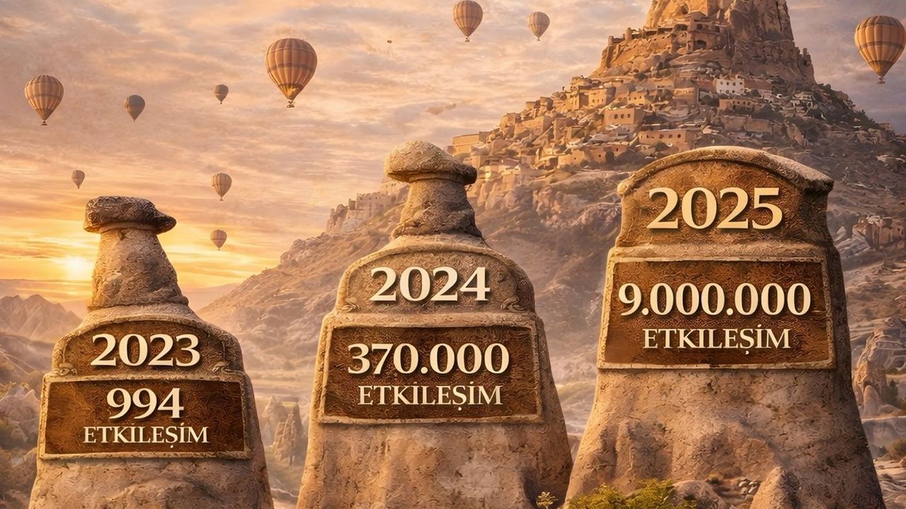 Nevşehir İl Kültür ve Turizm Müdürlüğü’nün sosyal medya hesaplarında 2023 yılında 1.000’in altında etkileşim gerçekleşirken, 2024’te bu rakam 370.000’e yükseldi. 2025 yılında ise dijital görünürlük, 9 milyon etkileşim ile tarihi bir seviyeye ulaştı.
