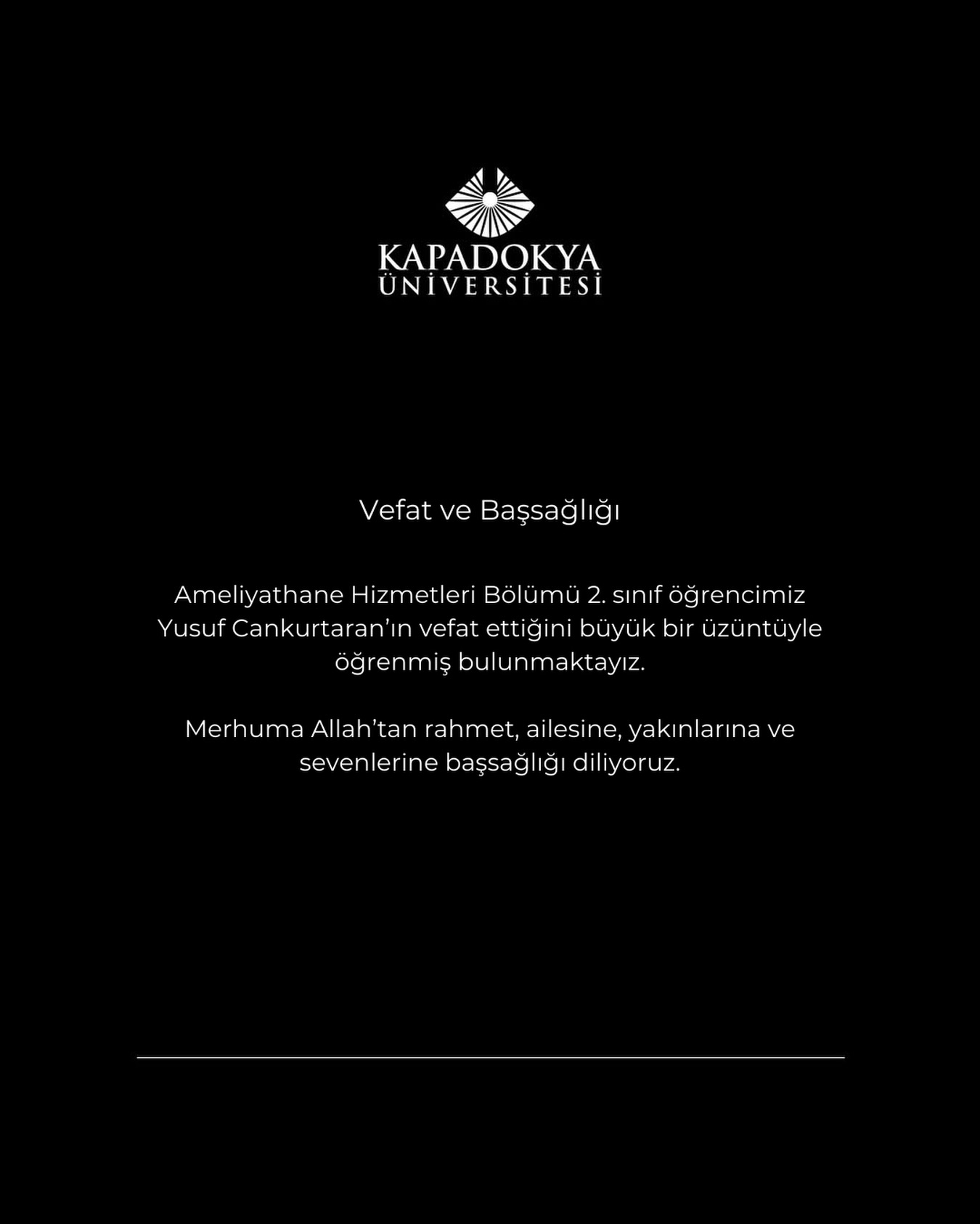 “Ameliyathane Hizmetleri Bölümü 2. sınıf öğrencimiz **Yusuf Cankurtaran’ın vefat ettiğini büyük bir üzüntüyle öğrenmiş bulunmaktayız. Merhuma Allah’tan rahmet, ailesine, yakınlarına ve sevenlerine başsağlığı diliyoruz.”