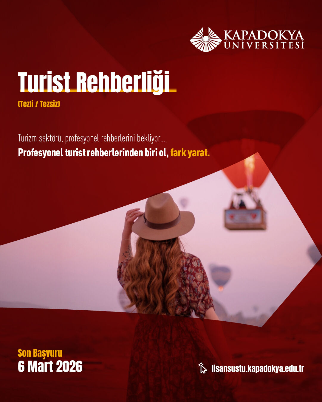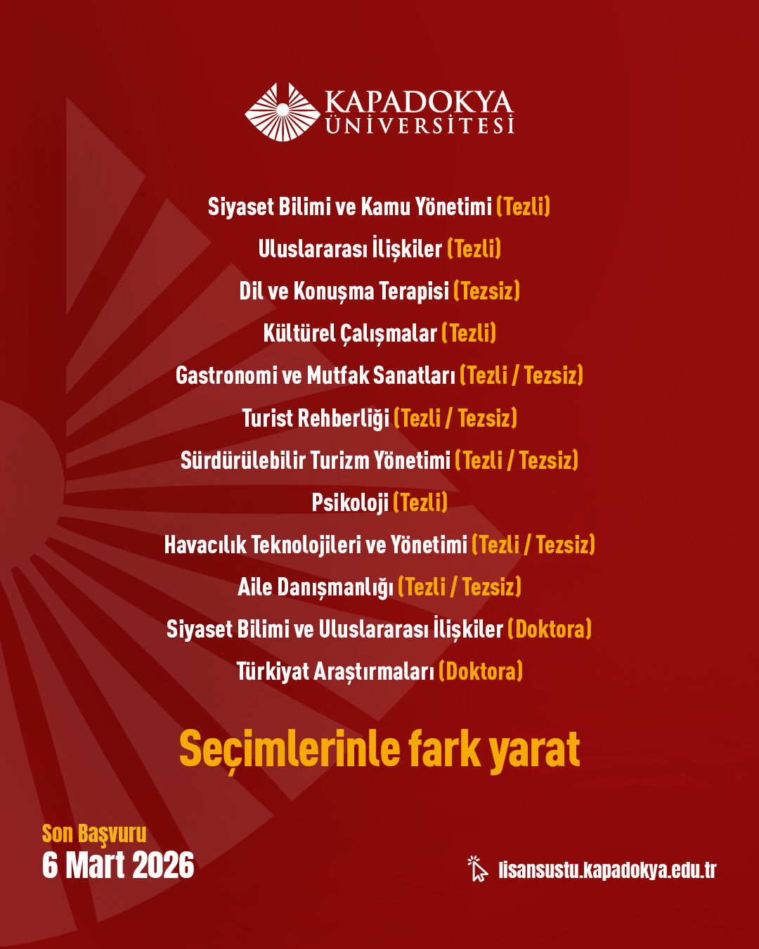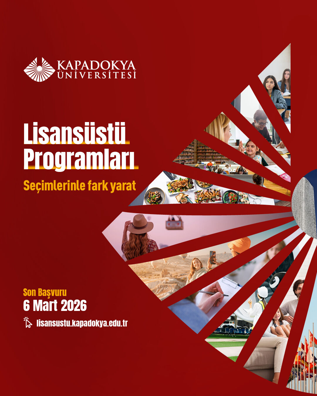 Kapadokya Üniversitesi, lisansüstü öğrenci adaylarını ‘Seçimlerinle Fark Yarat’ anlayışı doğrultusunda akademik yolculuklarını şekillendirmeye davet ediyor. 27 Şubat’ta başlayan ve 6 Mart 2026 tarihinde sona erecek lisansüstü başvuru şartlarına https://lisansustu.kapadokya.edu.tr/ adresinden ulaşılabiliyor; sorular ise [email protected] adresine iletilebiliyor.